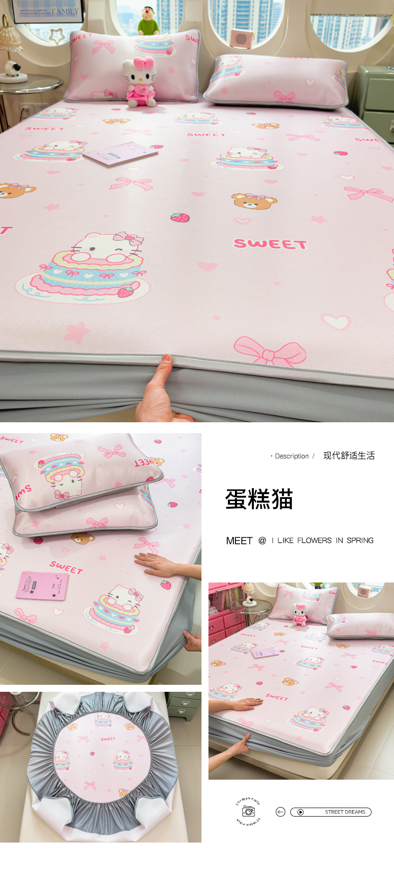 商品名称:丝羽坊 2026新款小版印花碳光冰丝凉席床笠款 蛋糕猫