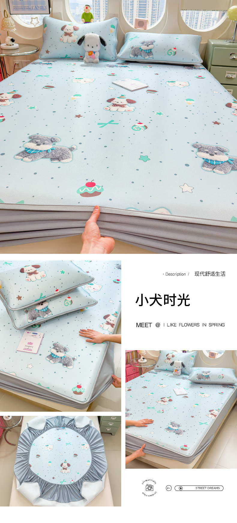(总)丝羽坊 2026新款高密凉感丝印花乳胶凉席-床笠款,雾蓝花影,萌宠拼格,粉黛萌兔,格纹蝶影,奶白萌犬,浅蓝熊趣,糖果猫咪,彩糖点点,林间私语,薄荷甜心,爱的圈圈,春意盎然,奶绿汪仔,小白兔,小企鹅,小兔派对,星月