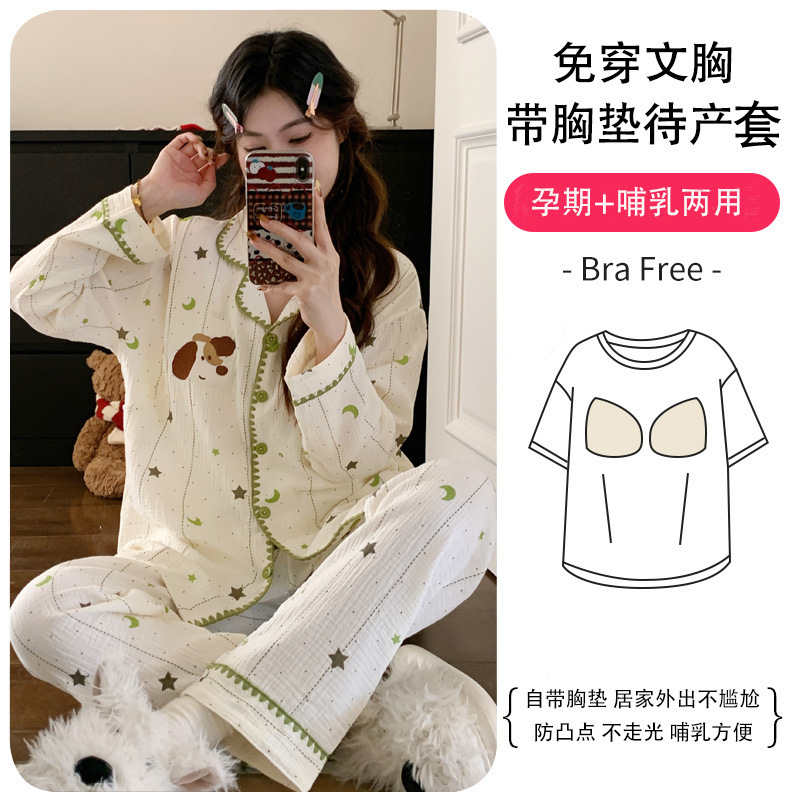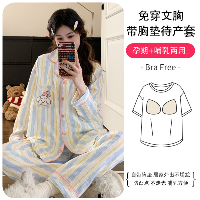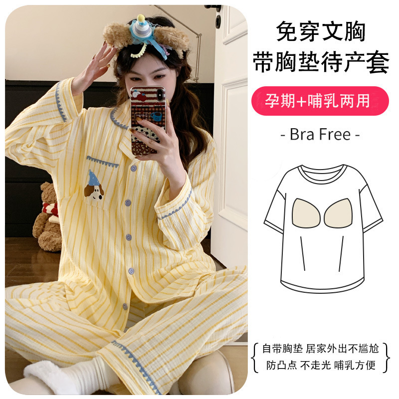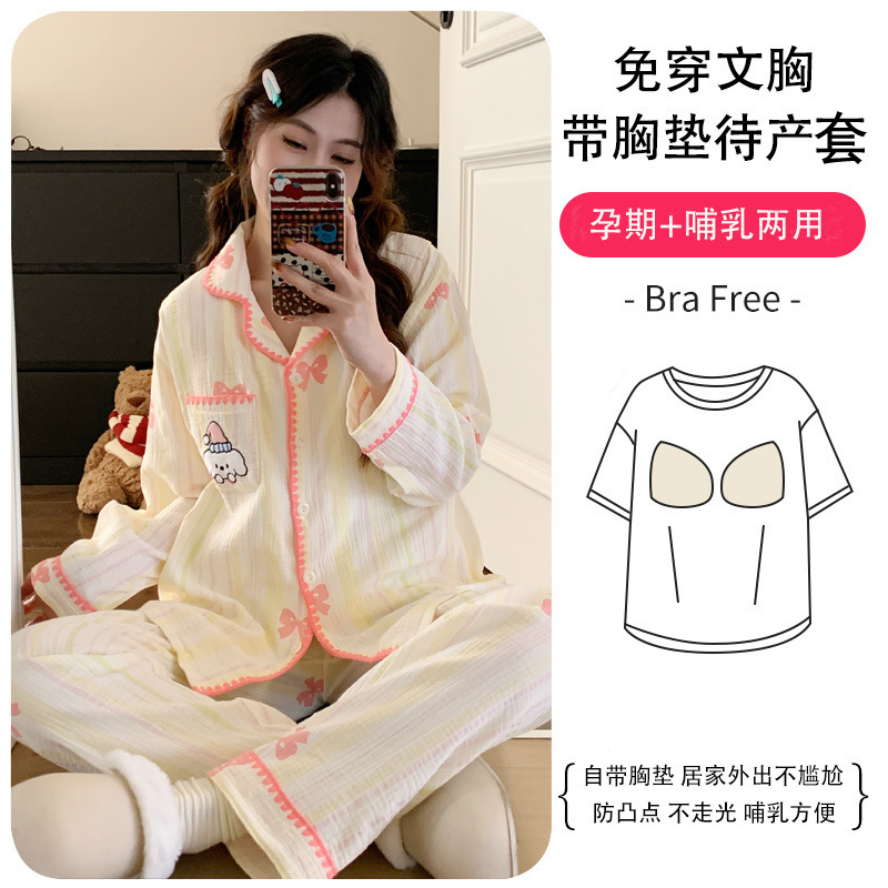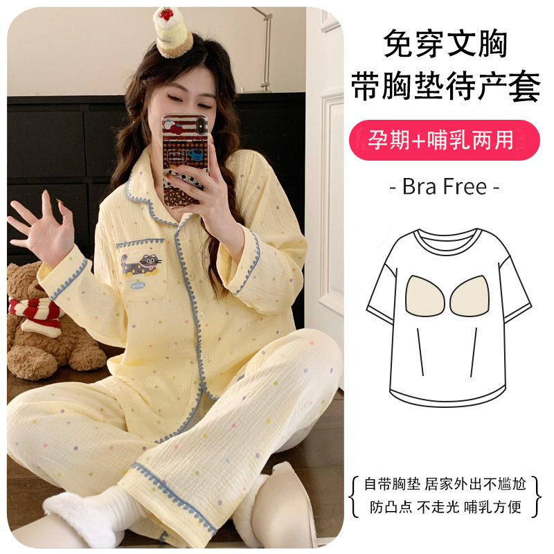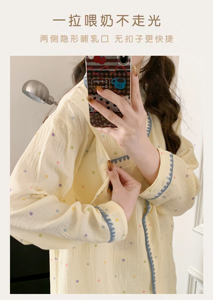 (总)洛兰沙家居馆 26年带胸垫纯棉双层纱布月子服春夏季新款孕妇哺乳长袖套装