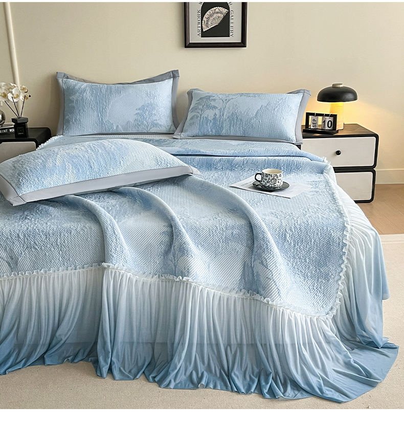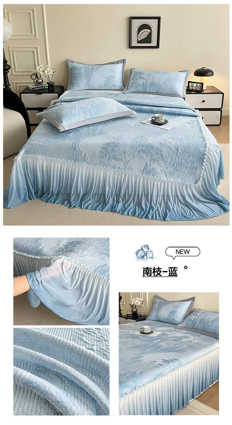 (总)莱米家纺 2026新款PE凉感冰豆豆床裙水墨画系列,南枝-粉,南枝-灰,南枝-蓝,南枝-绿