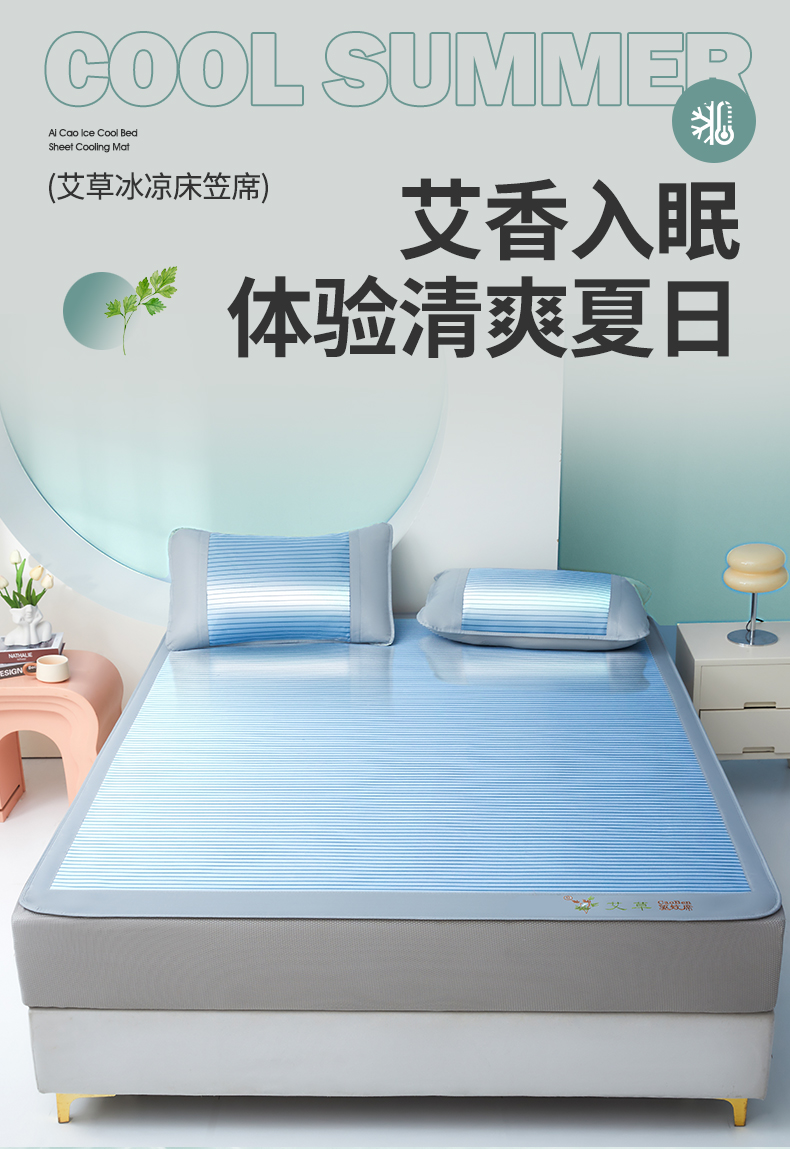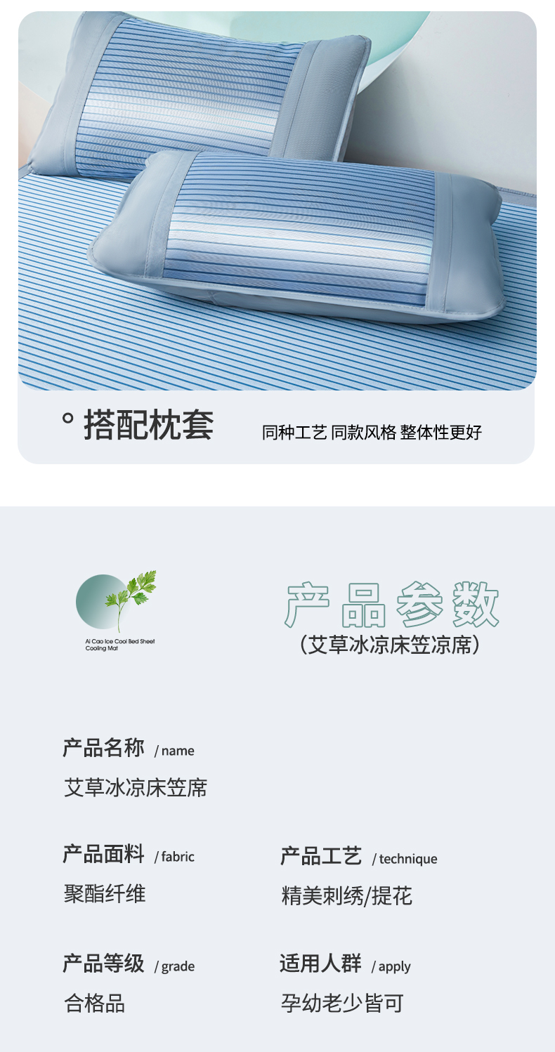 • 91家纺网 家纺一手货源 找家纺 航途席业 2025新款凉席三明治刺绣可水洗碳光冰丝席宽包边艾香系列 艾香条纹床笠款静谧蓝