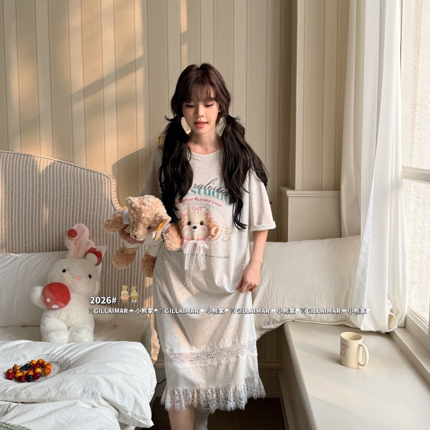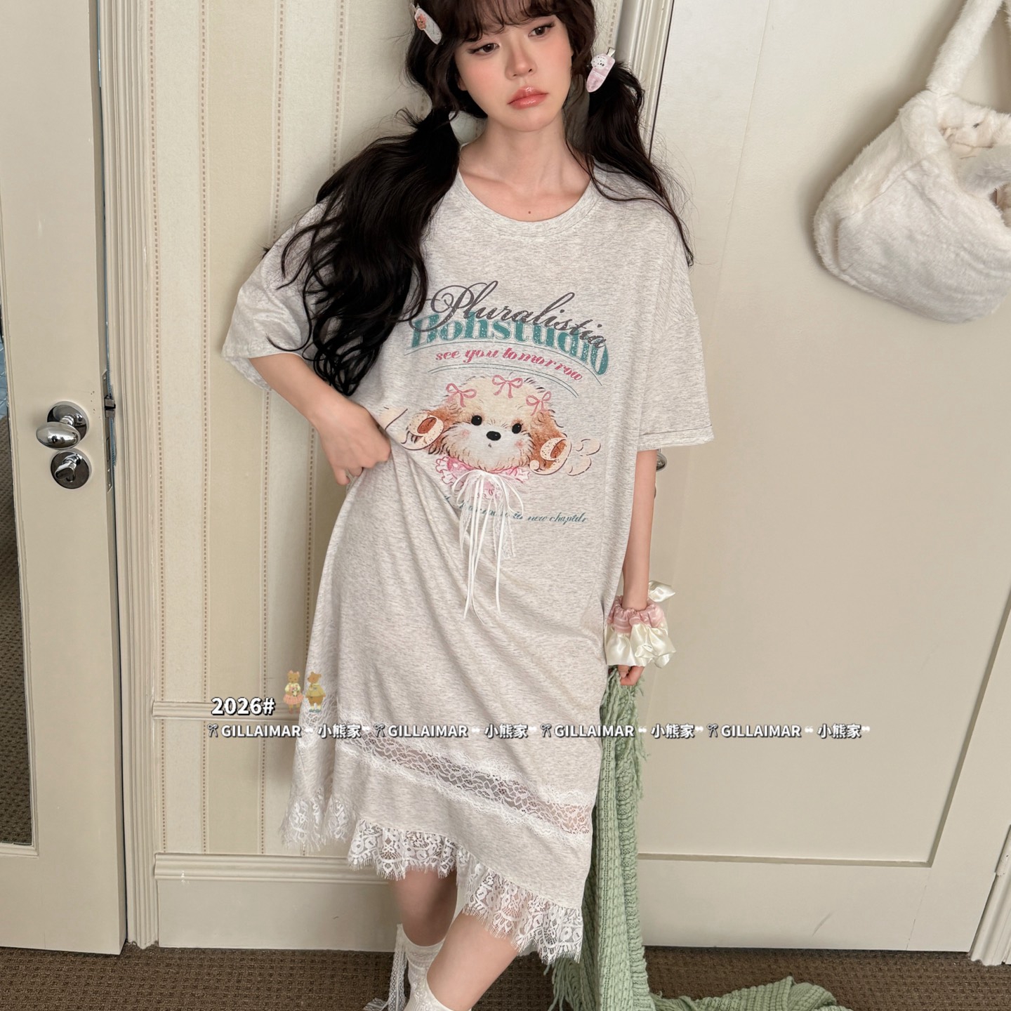• 91家纺网 家纺一手货源 找家纺 妍景家居生活馆 2026新款莱赛尔冰丝棉睡裙-星星小狗T 星星小狗T-灰色