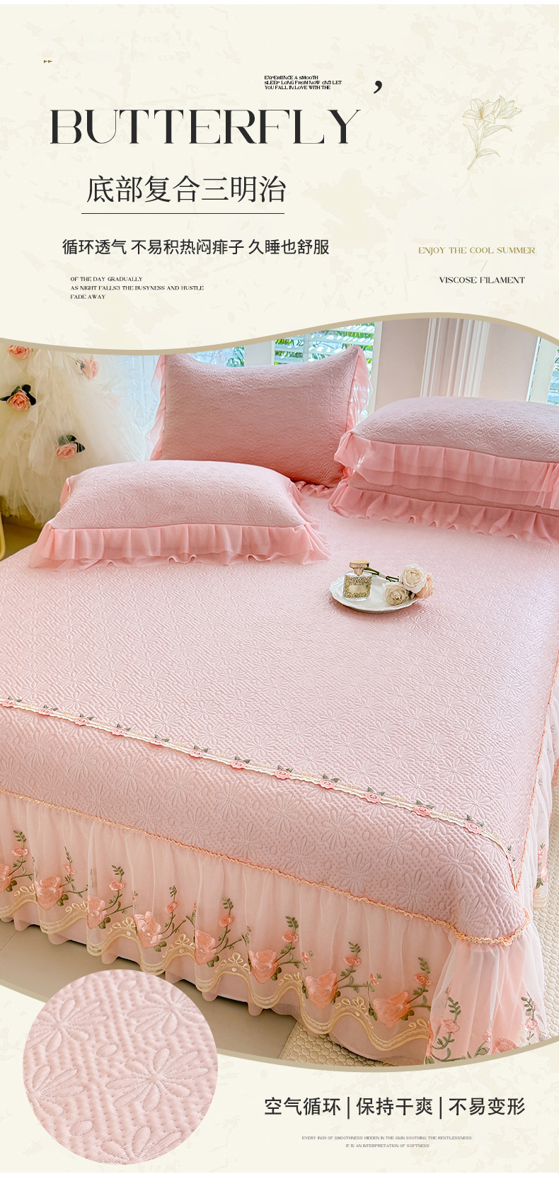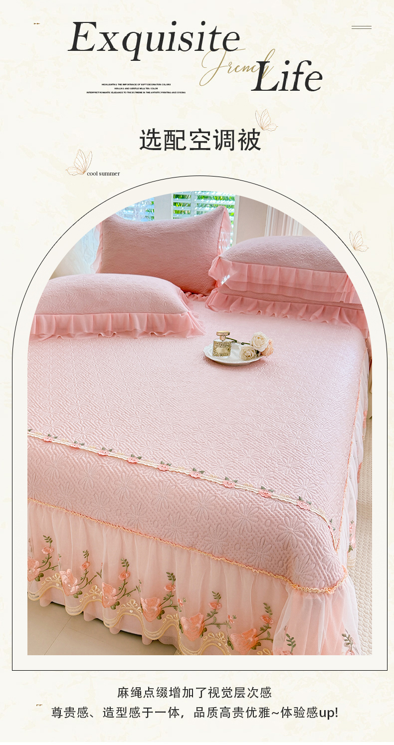 商品名称:苏米娜家纺SUMINA 2026春夏新款PE高分子双层蕾丝刺绣花边床裙款凉席三件套-伊莉莎系列 伊莉莎-粉黛