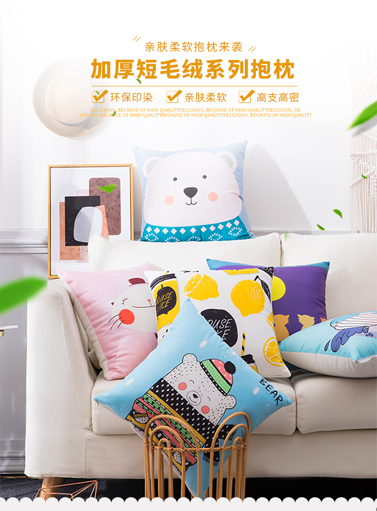 (总)橘夏纺织品 2025新款亲肤短毛绒印花抱枕,爱情鸟,爱心熊,呆萌熊,粉色猫咪,开心鳄鱼,蓝鲸鱼,两小无猜,猫头鹰,母子熊,柠檬茶,土拨鼠,晚安猫,围巾熊,小恐龙,小奶牛,眼镜狗