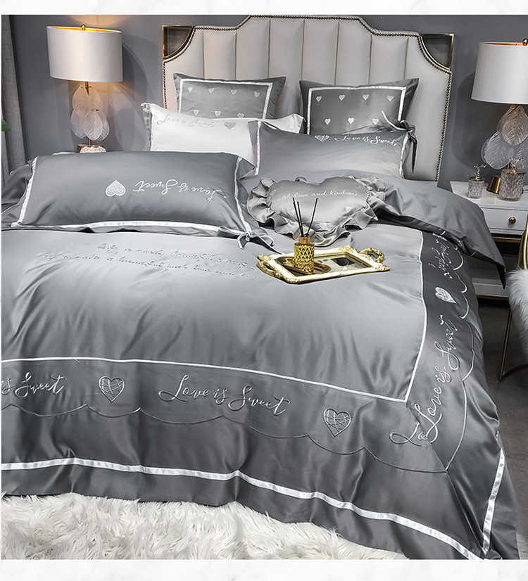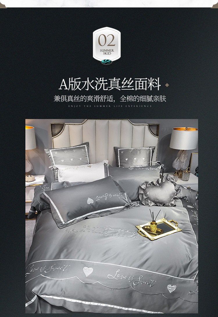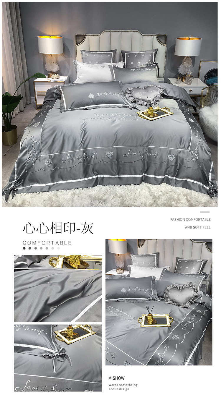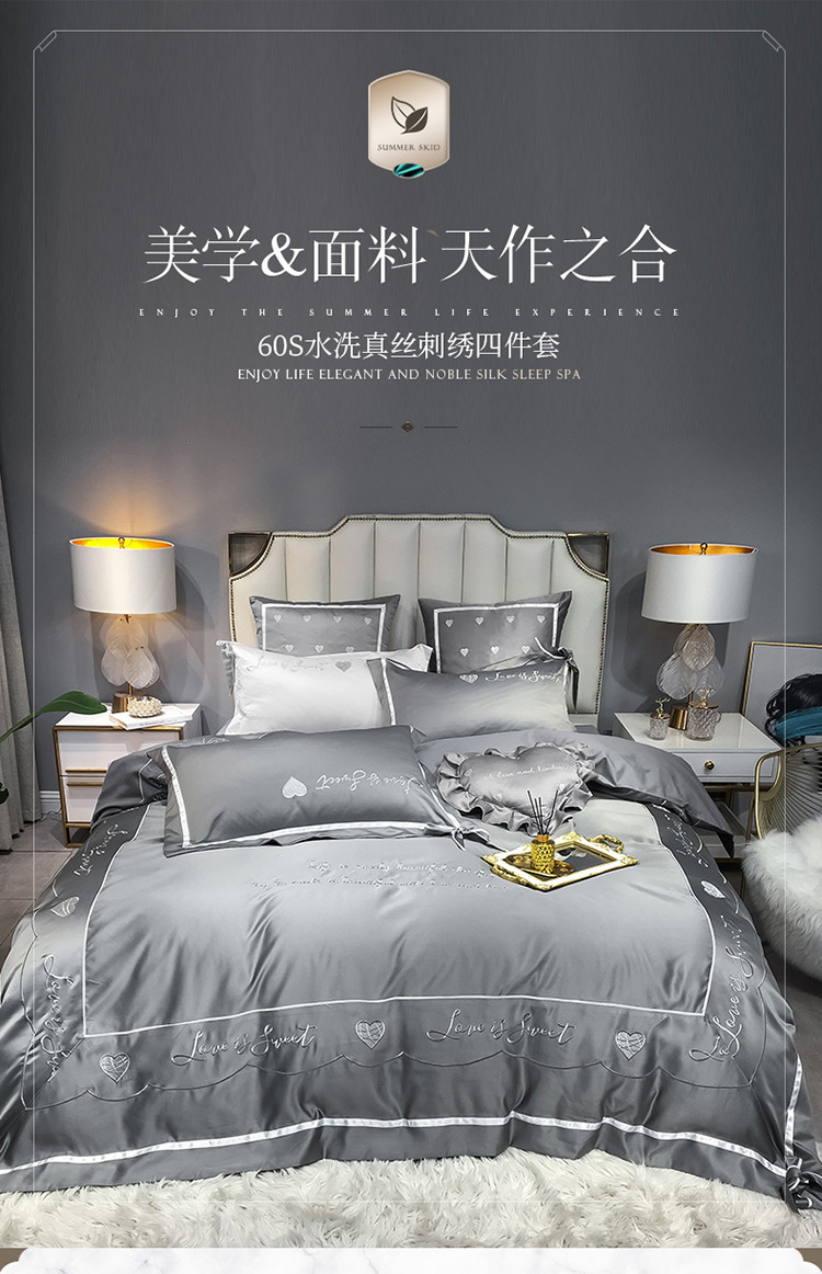 眠帛家居 2020新款60水洗真丝刺绣心心相印四件套 灰色