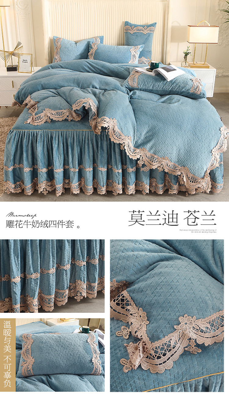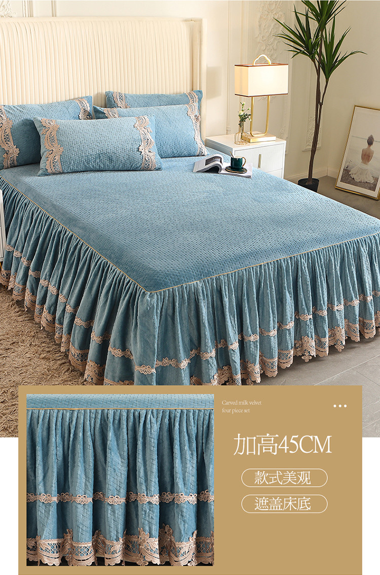 网红馆 2025新款牛奶绒雕花床裙四件套 莫兰迪-苍兰