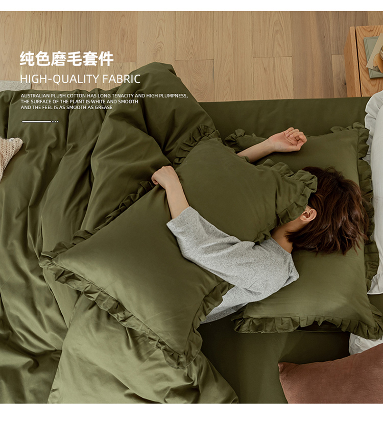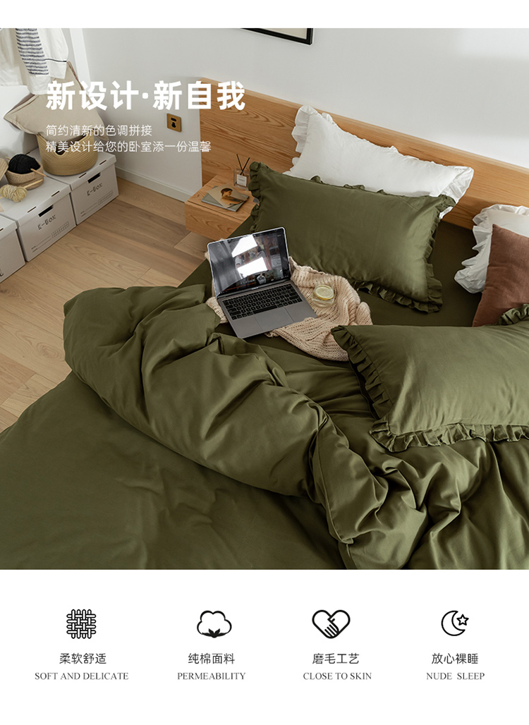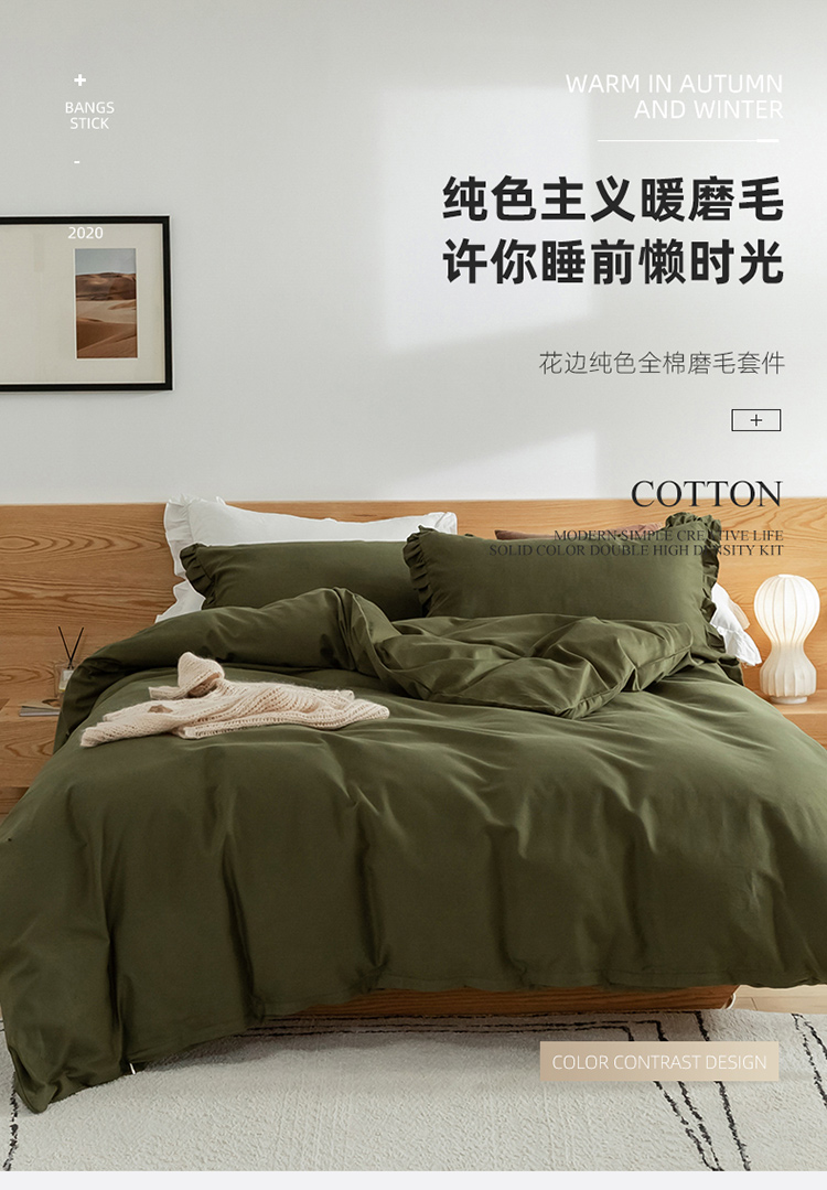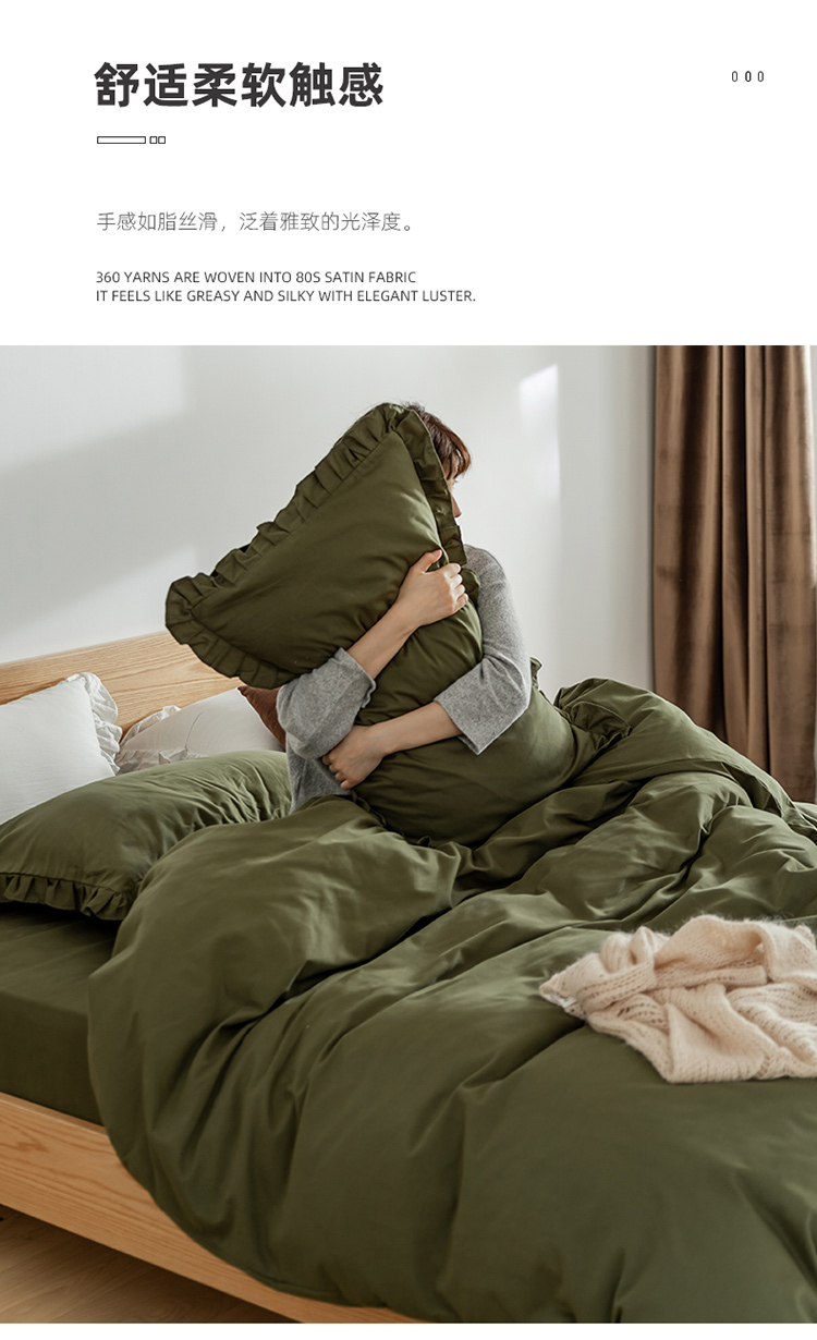 当前位置: 91家纺网 > 商品网购 > 床品套件 > 四件套 > 普通磨毛四件套 > 窝米 2020新款40s纯色磨毛四件套花边系列 墨绿