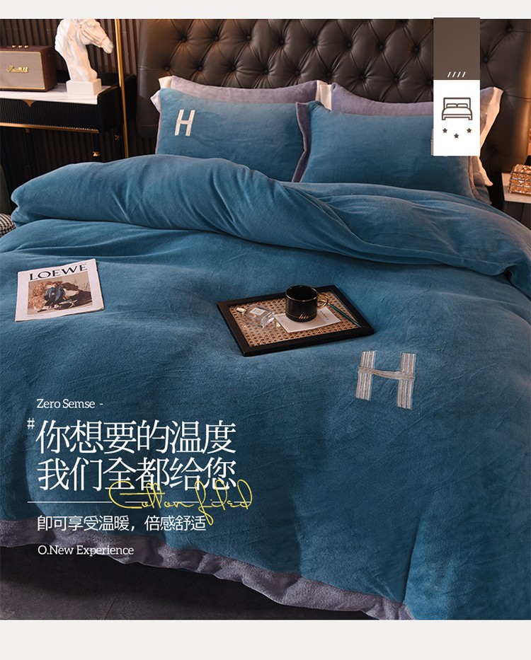 艾米家居 2021新款牛奶绒刺绣H款四件套 深蓝