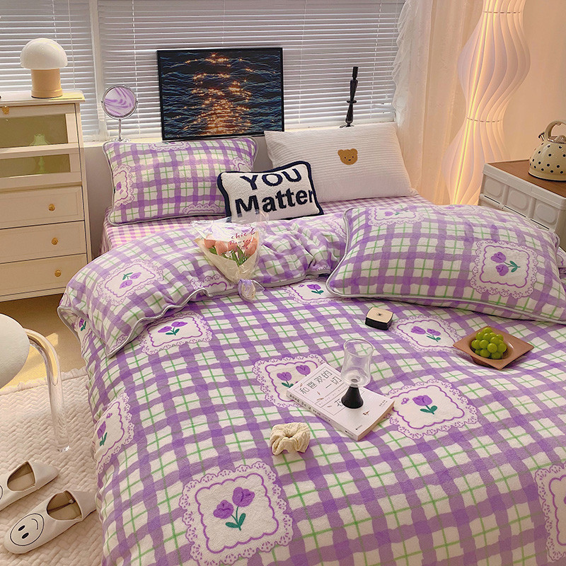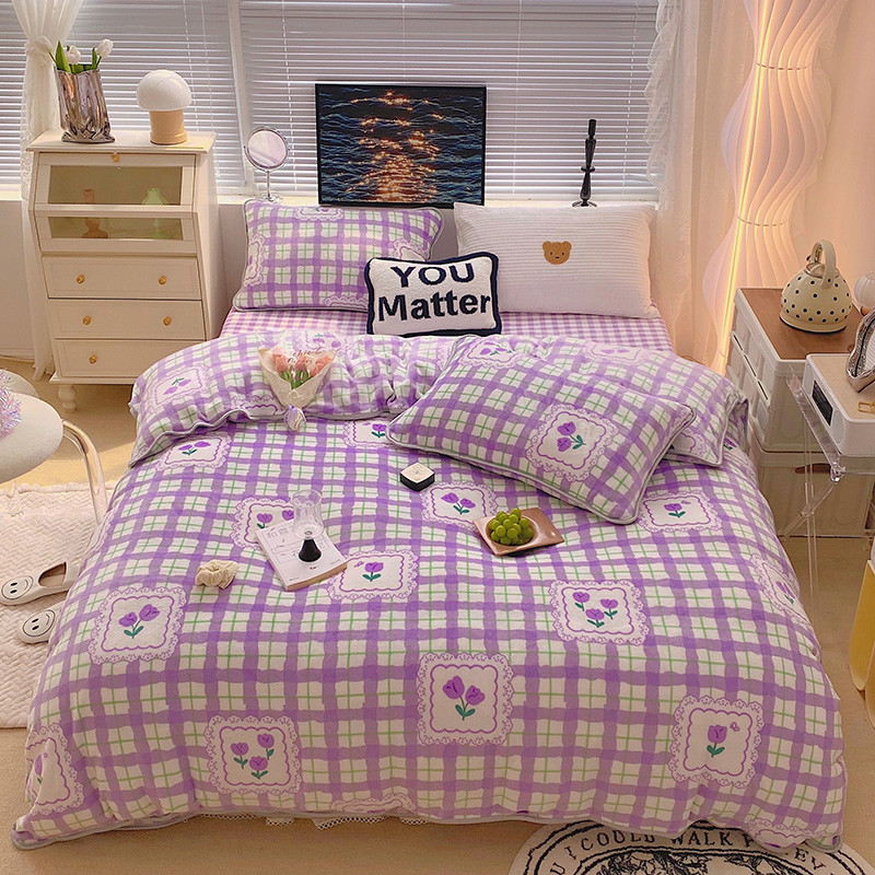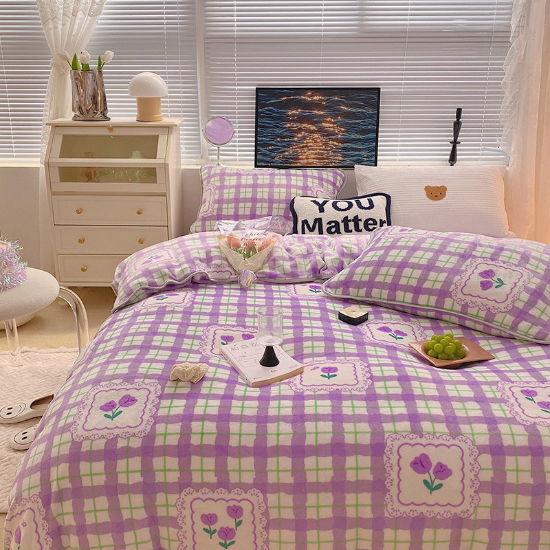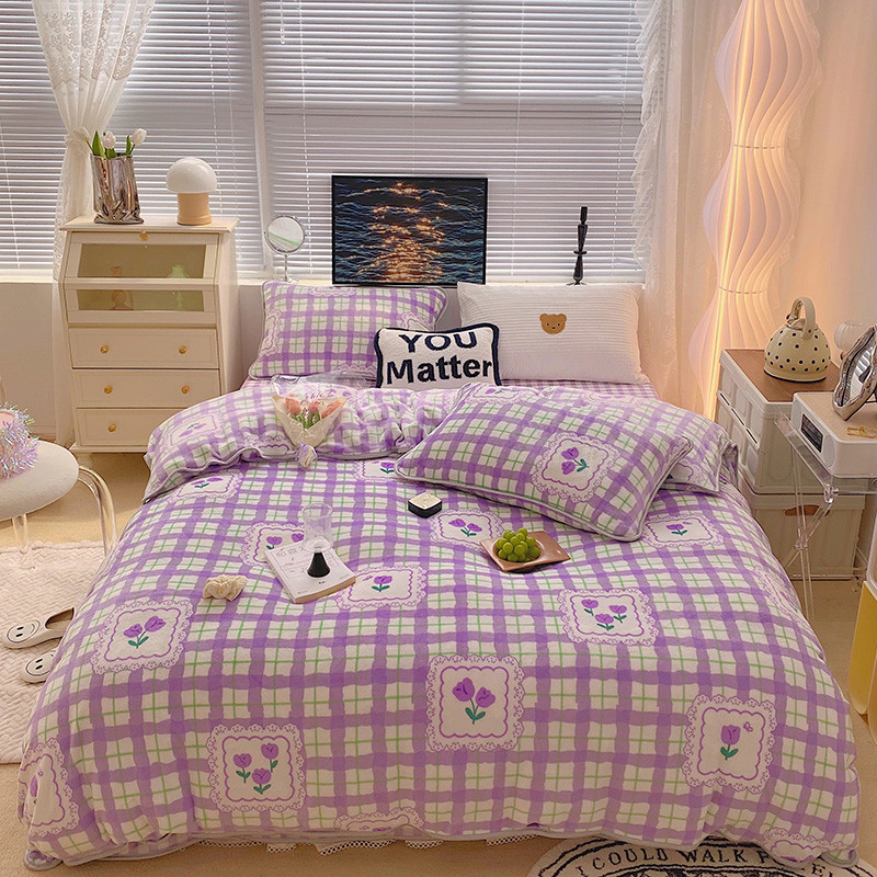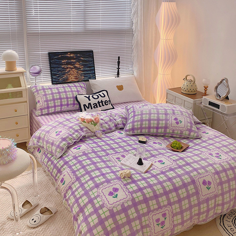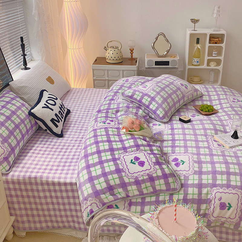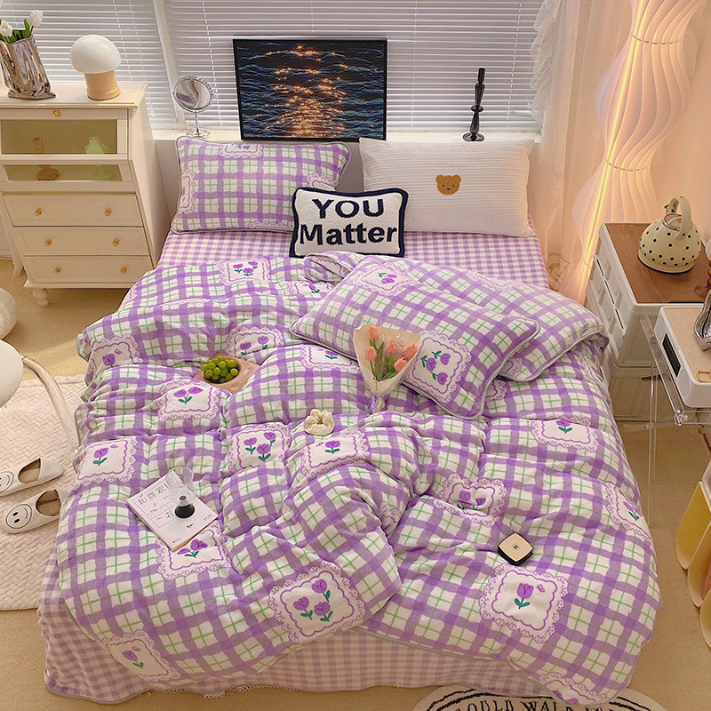 顾里2021新款ins韩国高端保暖牛奶绒四件套 格子郁金香
