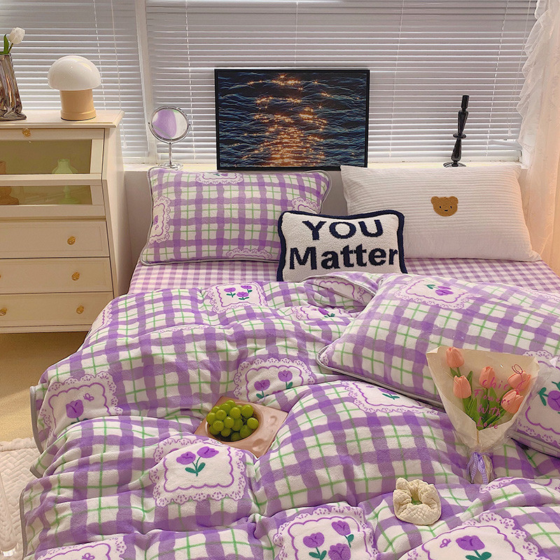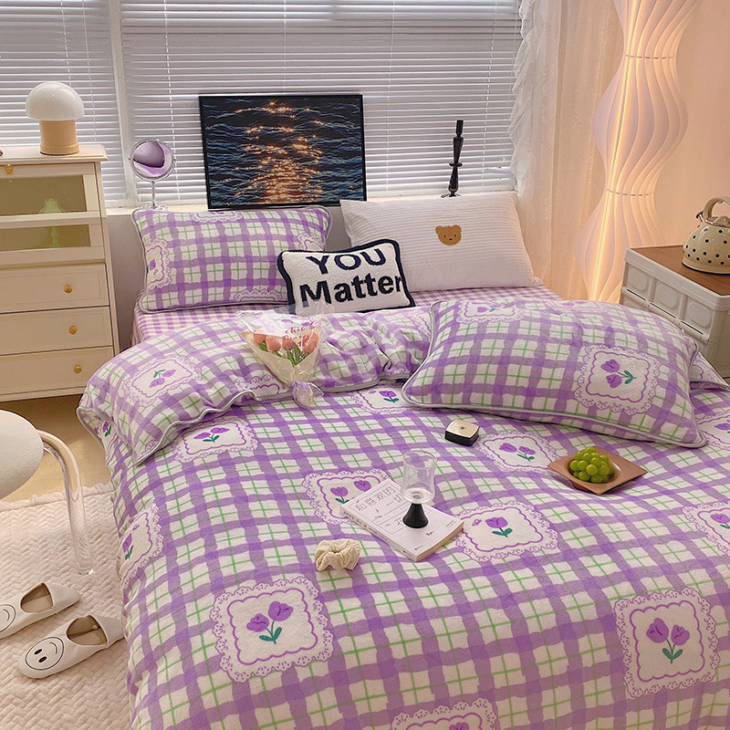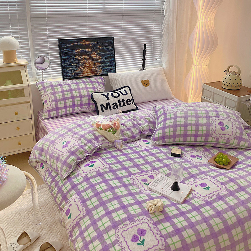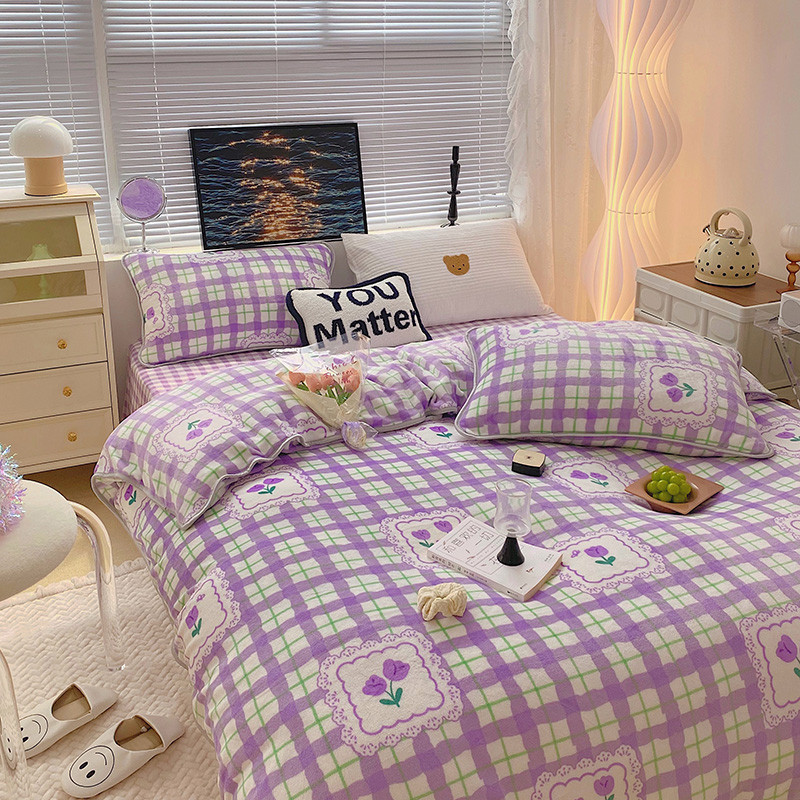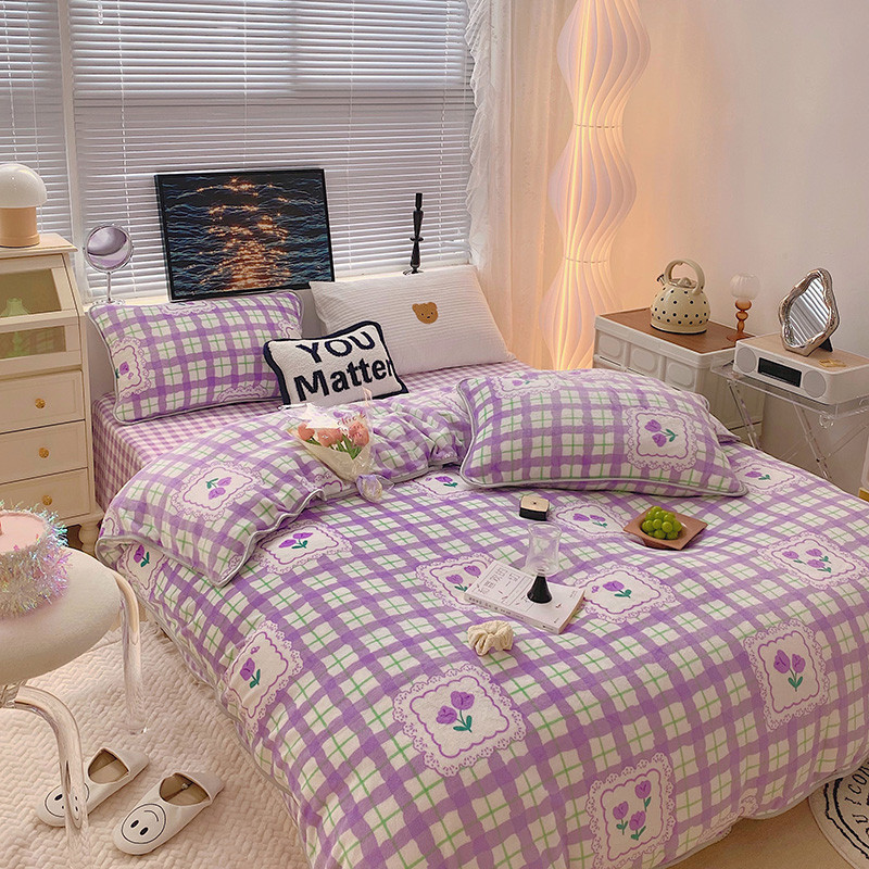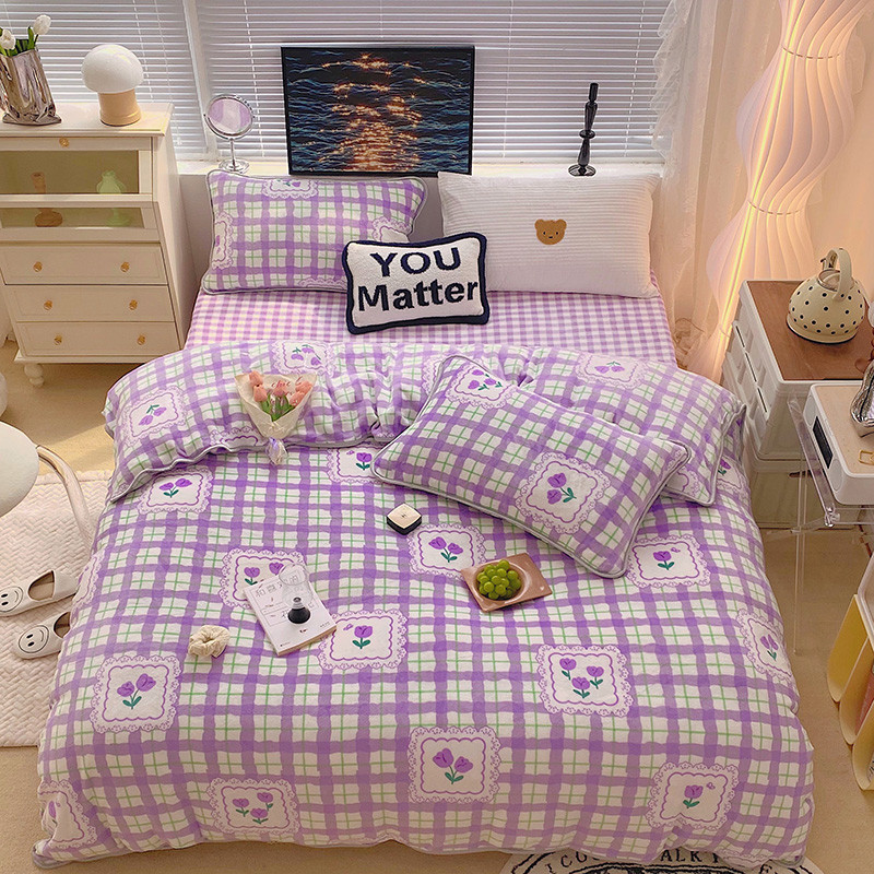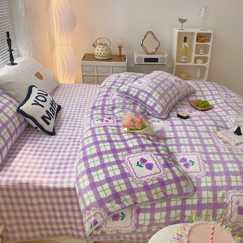 顾里2021新款ins韩国高端保暖牛奶绒四件套 格子郁金香