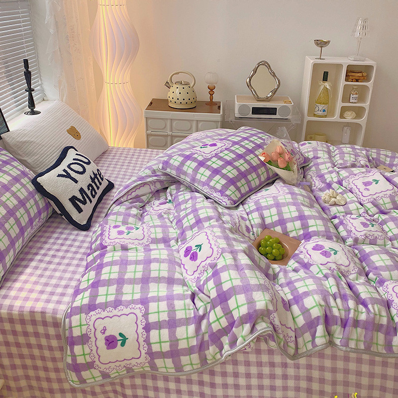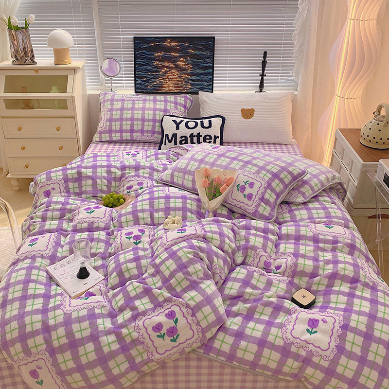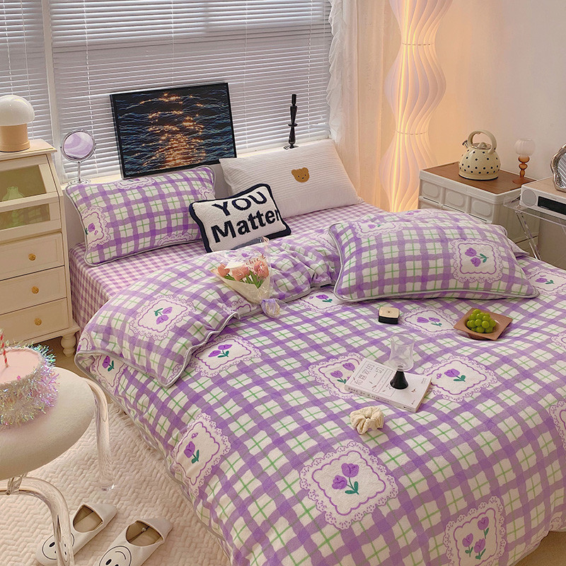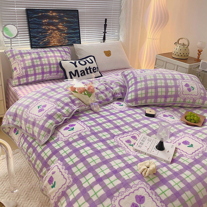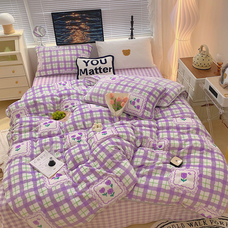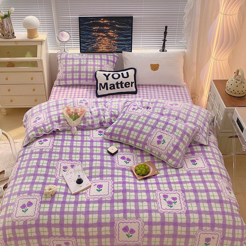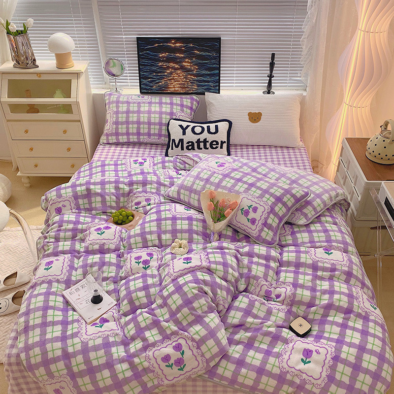 顾里2021新款ins韩国高端保暖牛奶绒四件套 格子郁金香