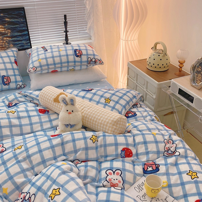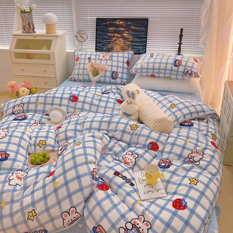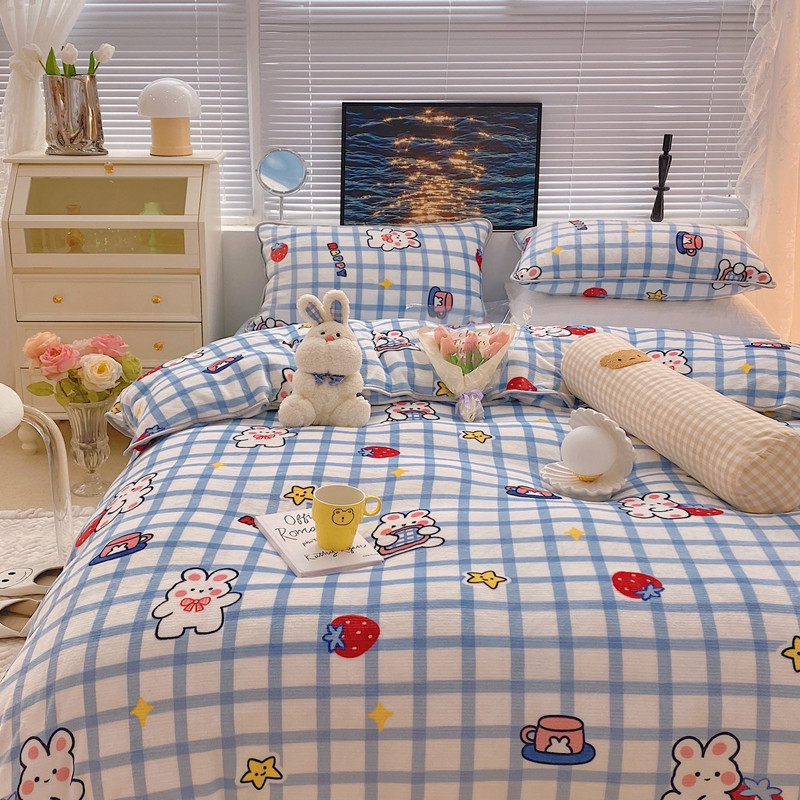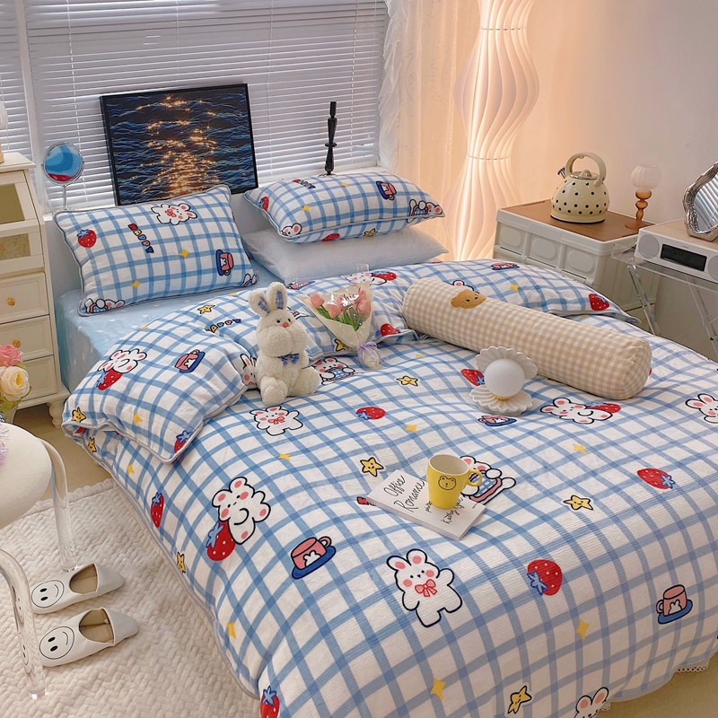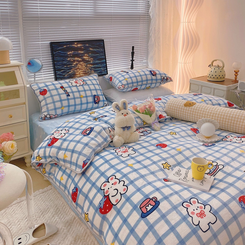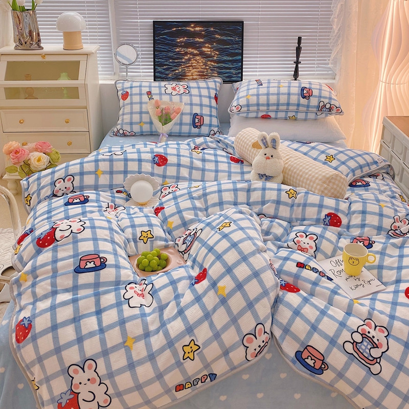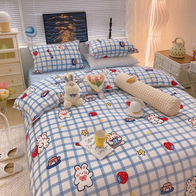 顾里2021新款ins韩国高端保暖牛奶绒四件套 蓝格小兔