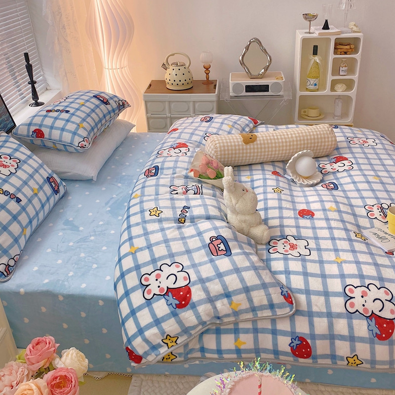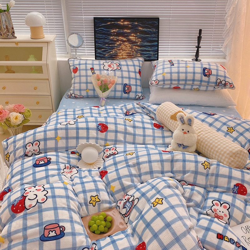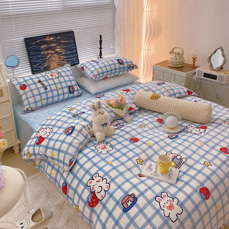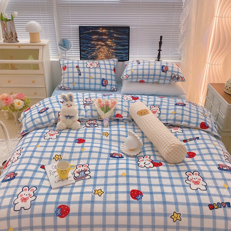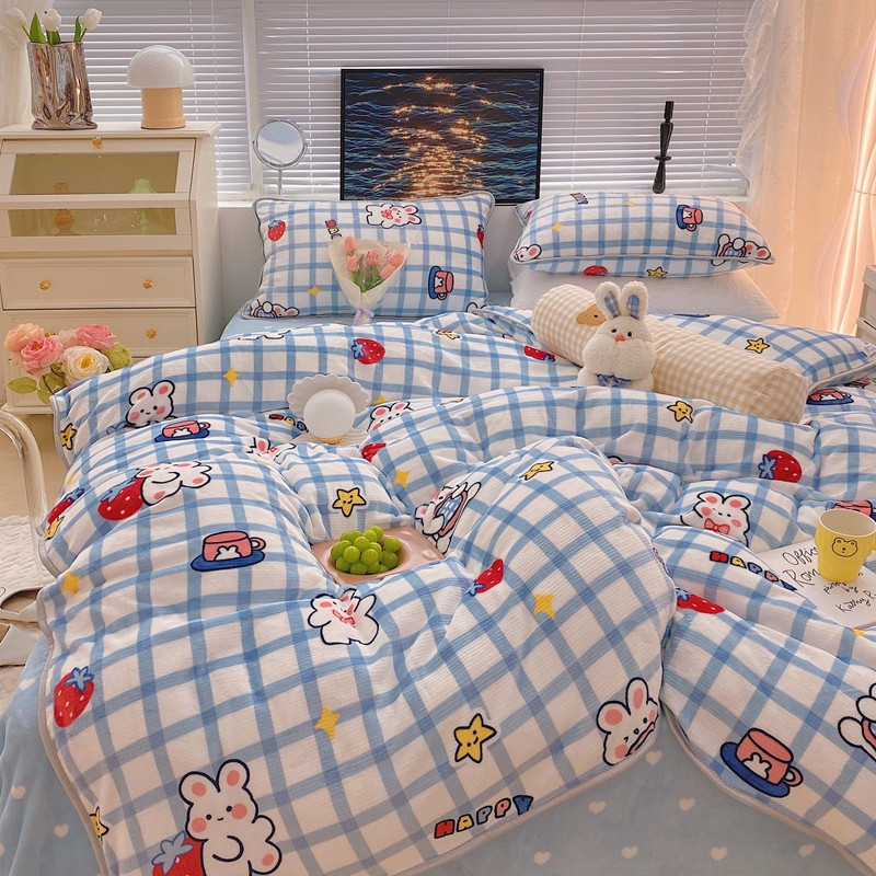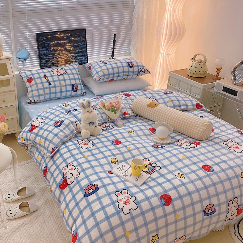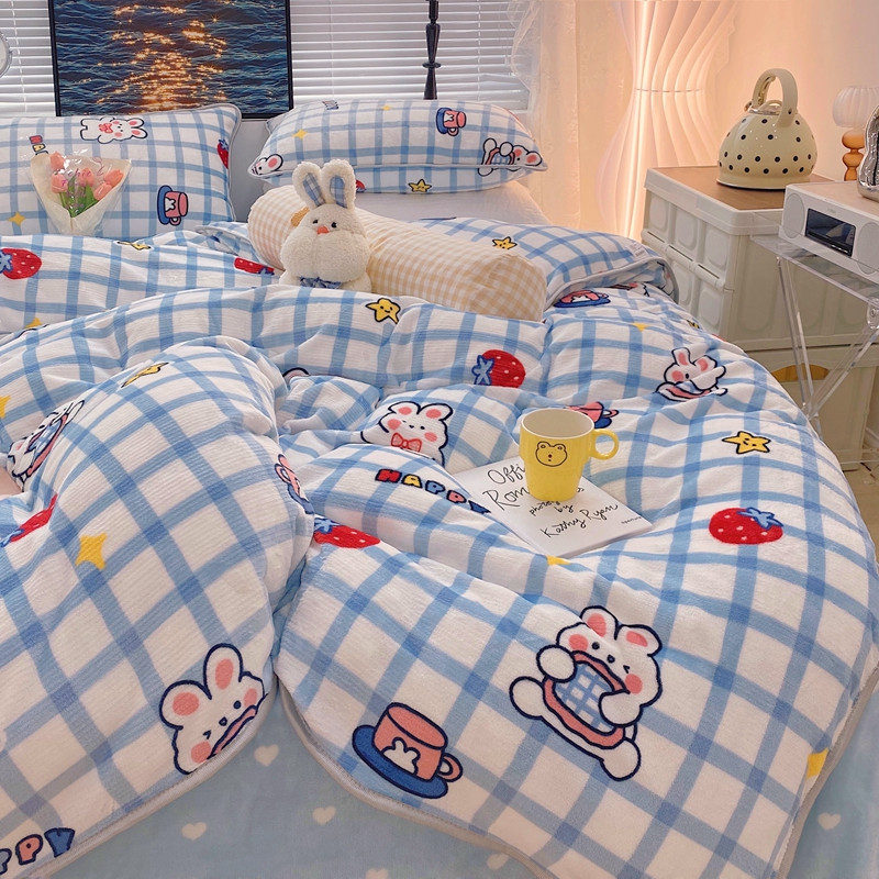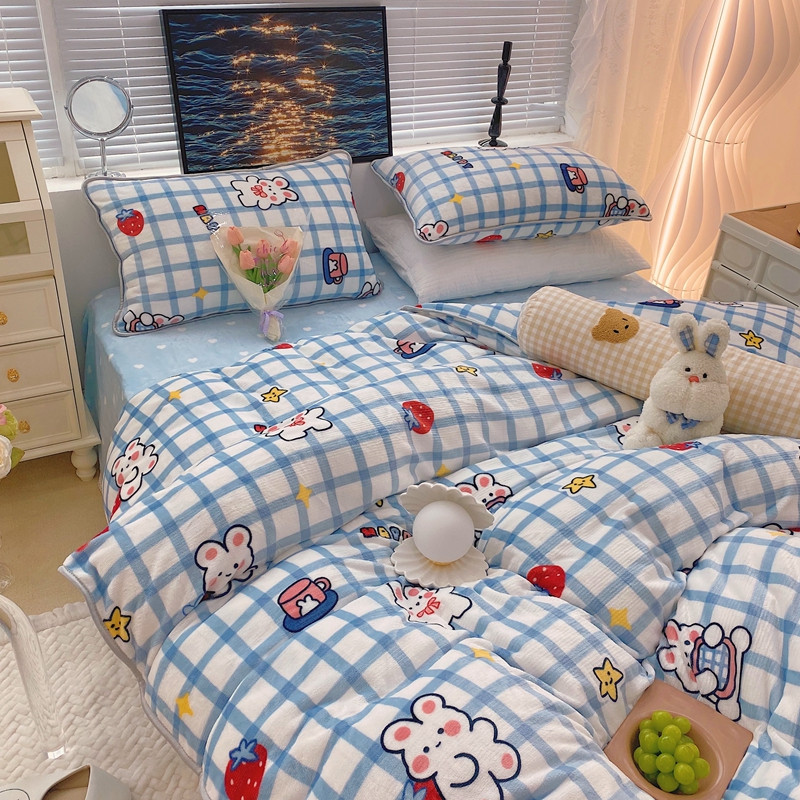 顾里2021新款ins韩国高端保暖牛奶绒四件套 蓝格小兔