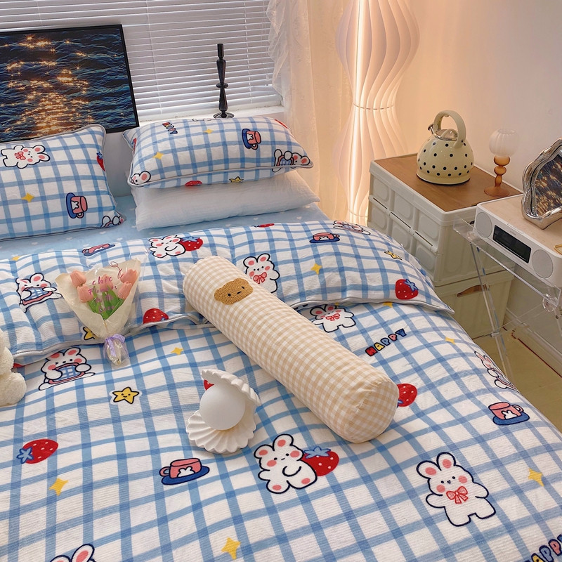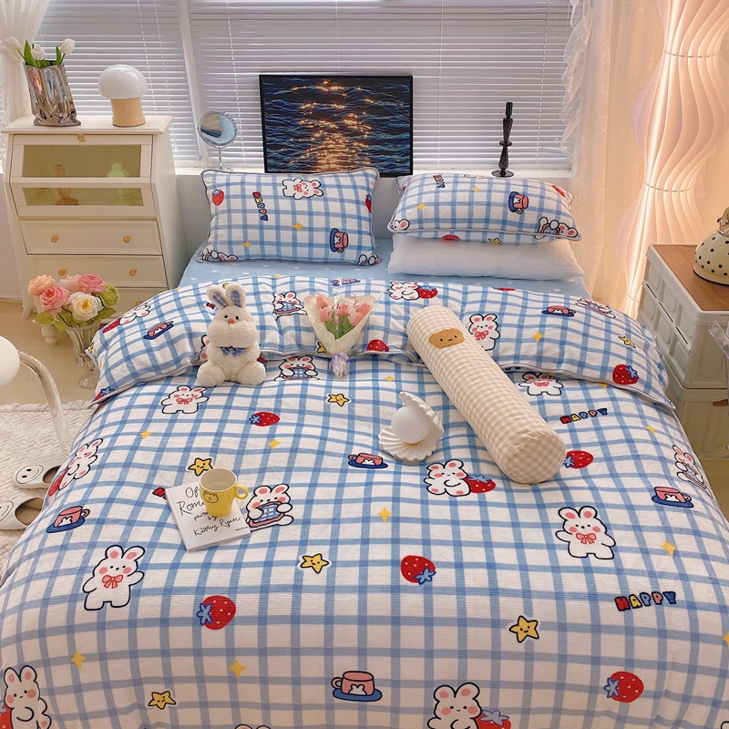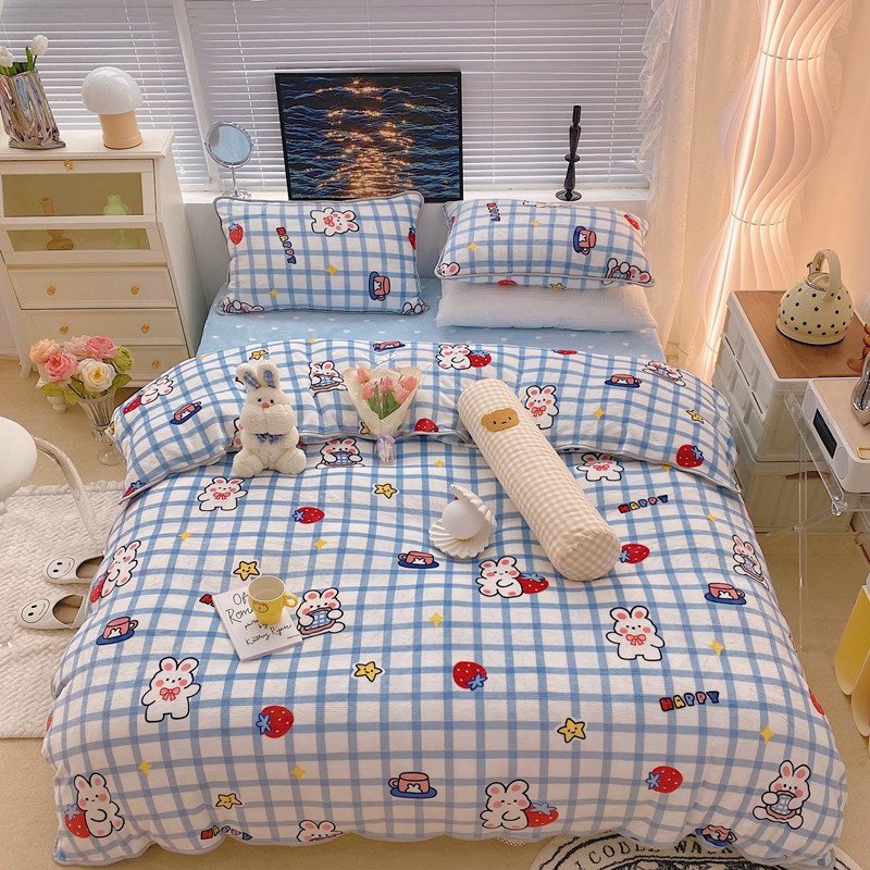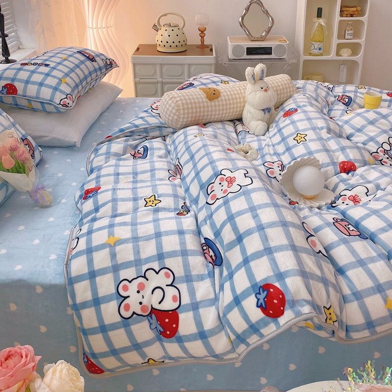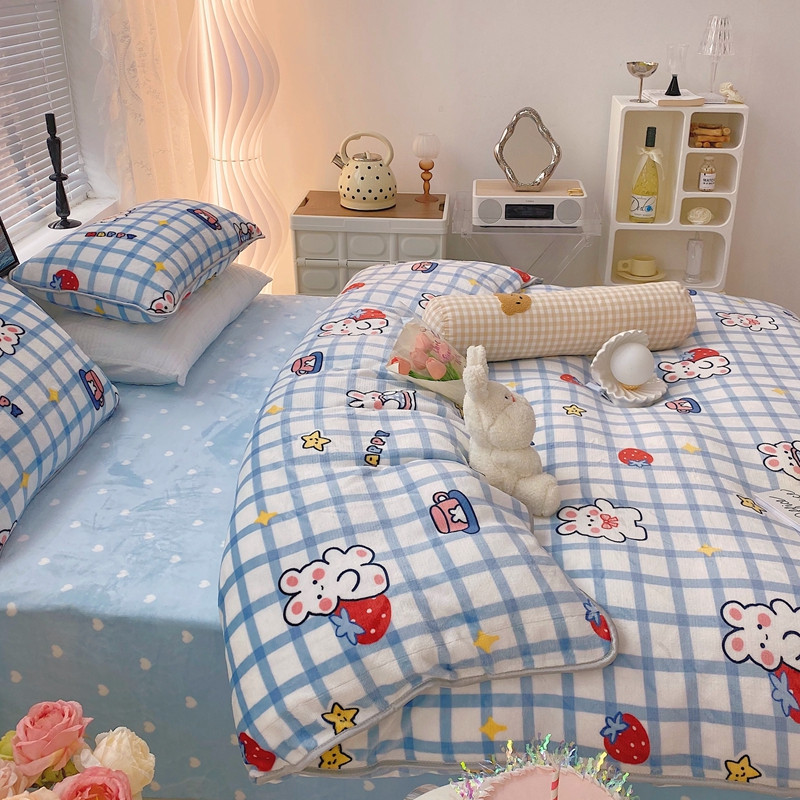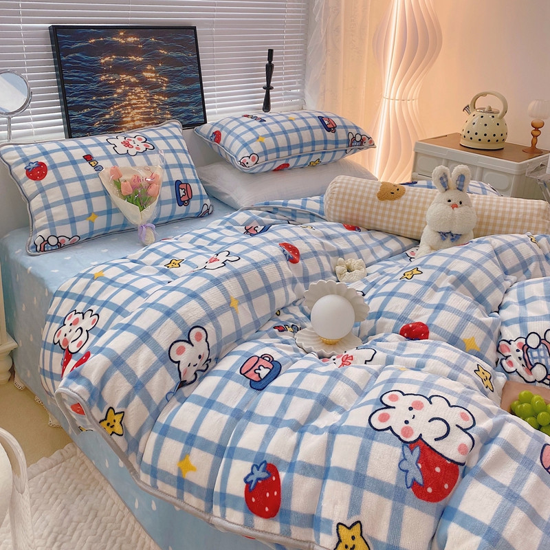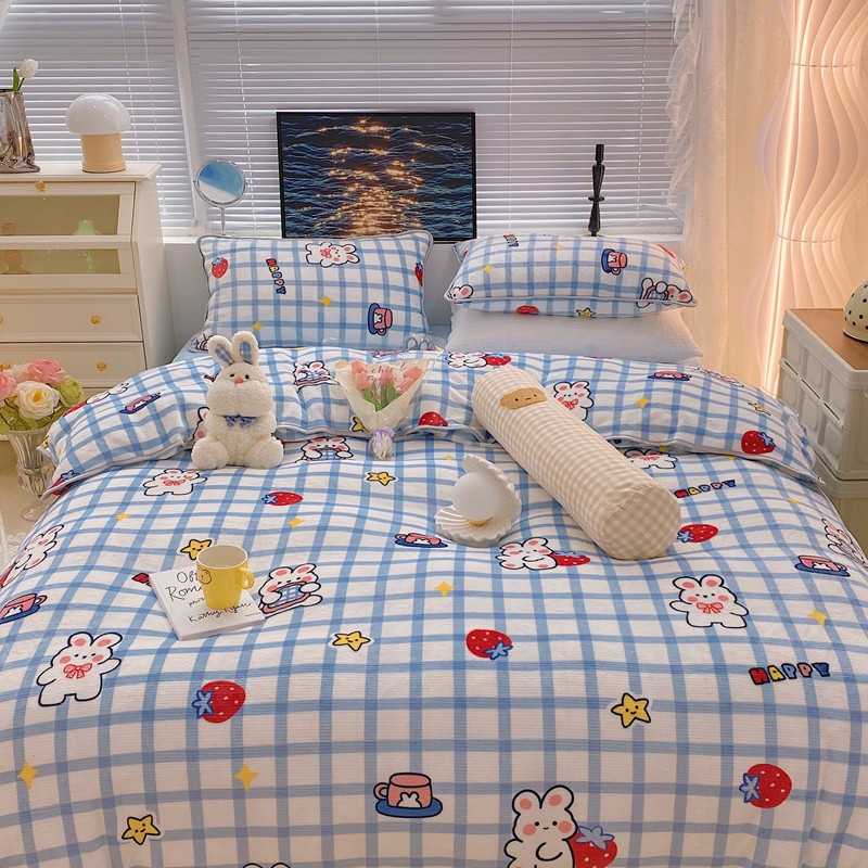 顾里2021新款ins韩国高端保暖牛奶绒四件套 蓝格小兔