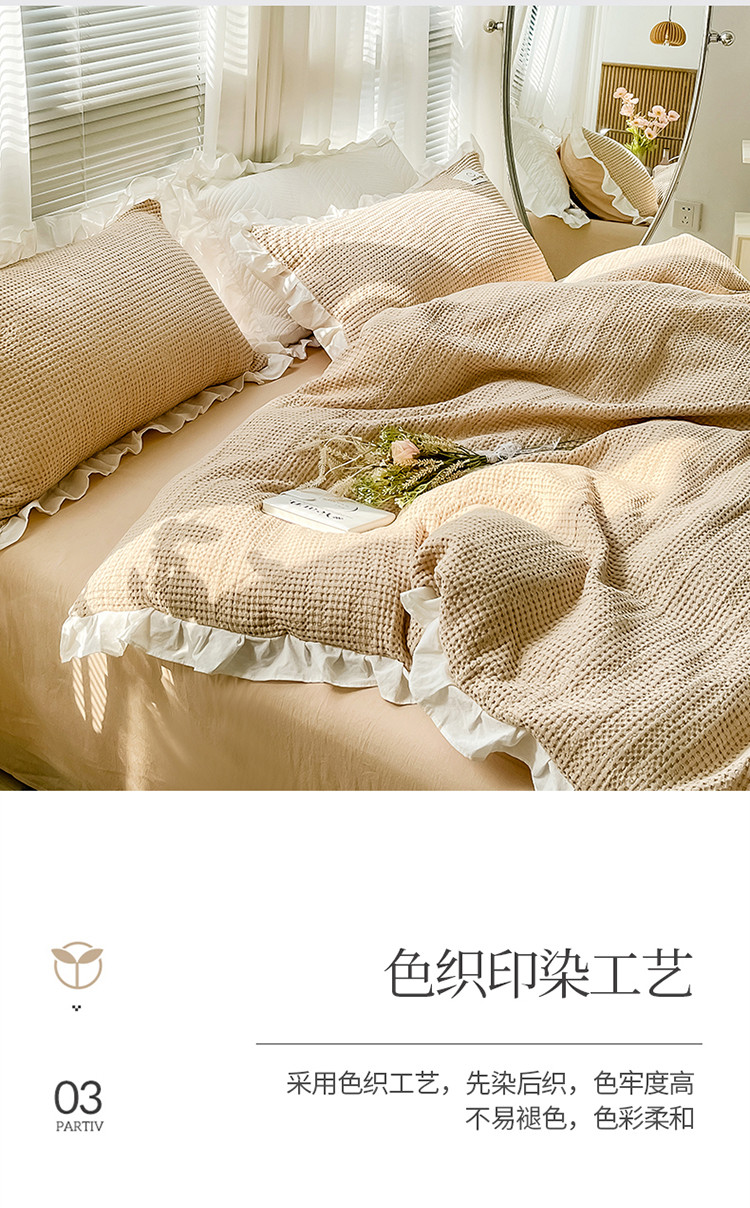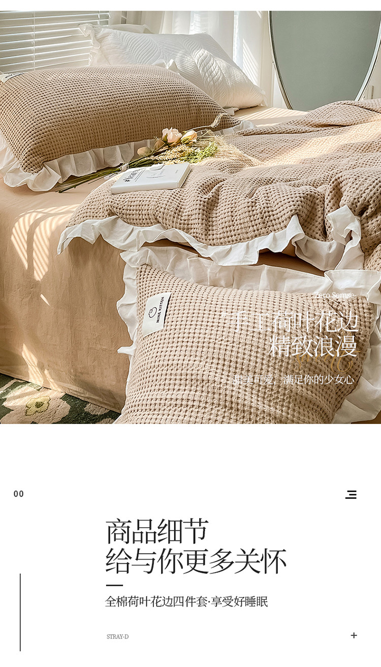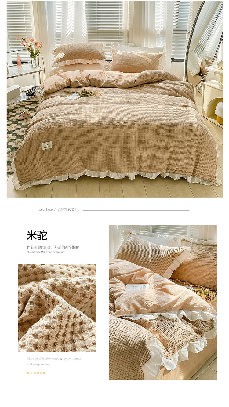 雅萱 2022新款全棉华夫格水洗棉四件套花边款 米驼