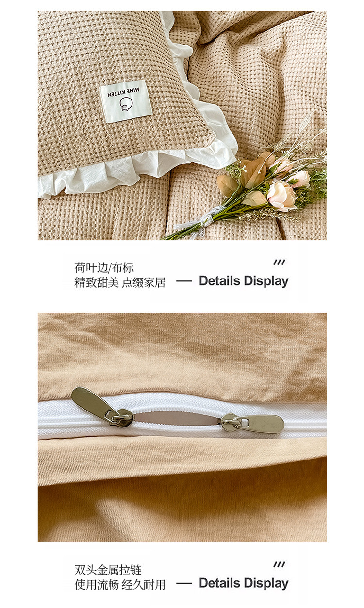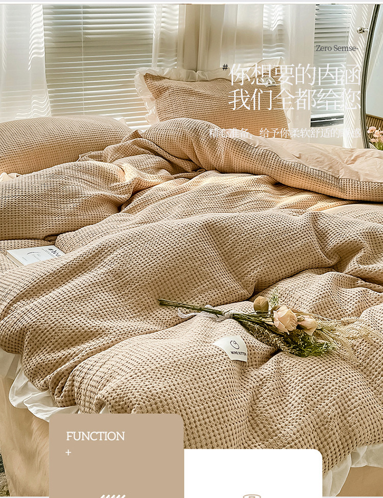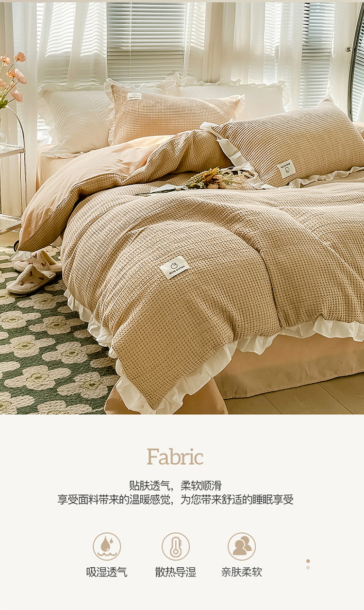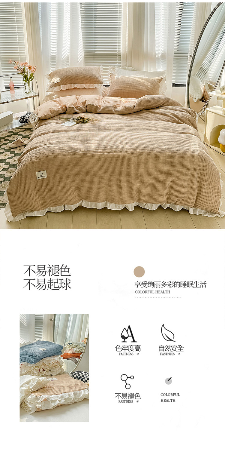 雅萱 2022新款全棉华夫格水洗棉四件套花边款 米驼