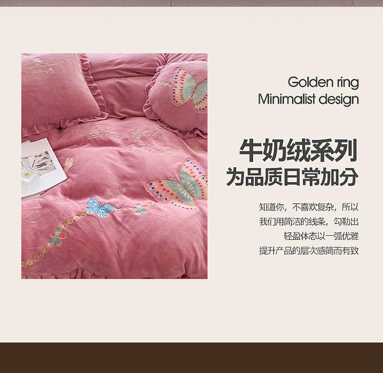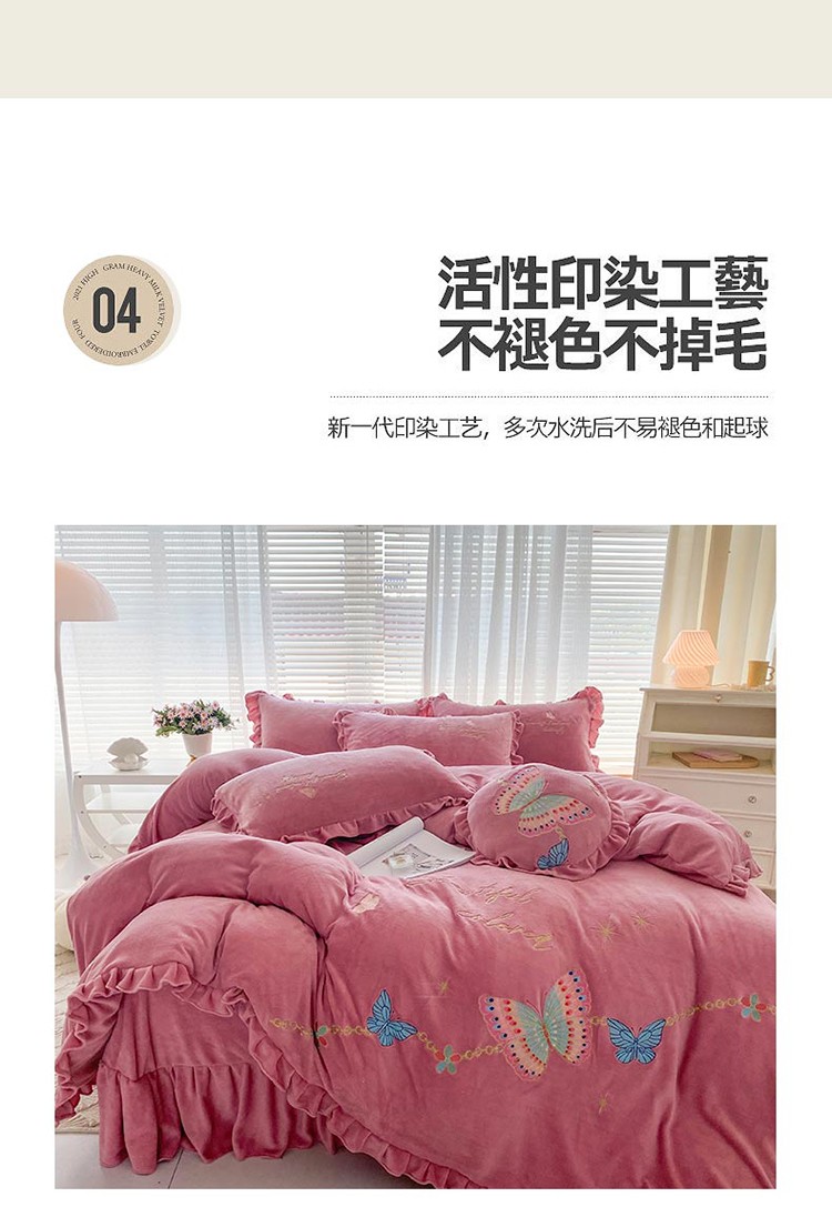 铠畅直播供货轻奢韩版花边高克重牛奶绒刺绣四件套床裙款蝶恋豆沙