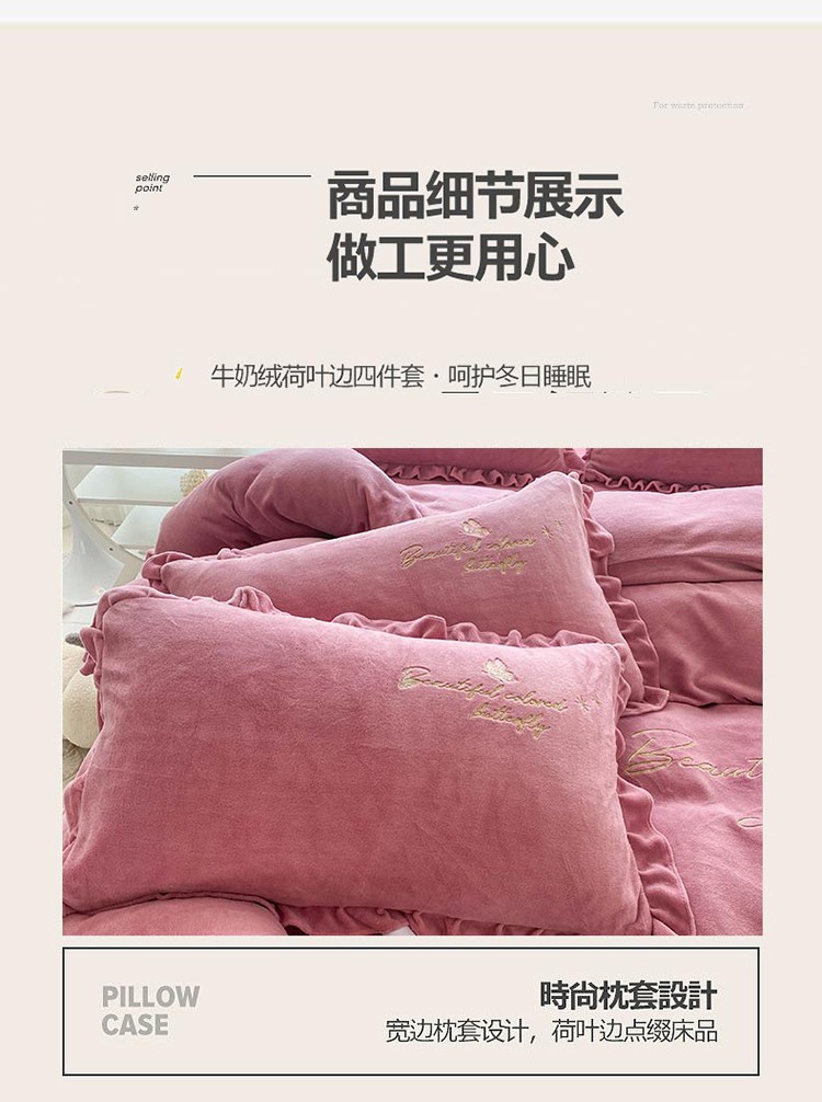 商品名称:铠畅直播供货轻奢韩版花边高克重牛奶绒刺绣四件套床裙款蝶恋豆沙