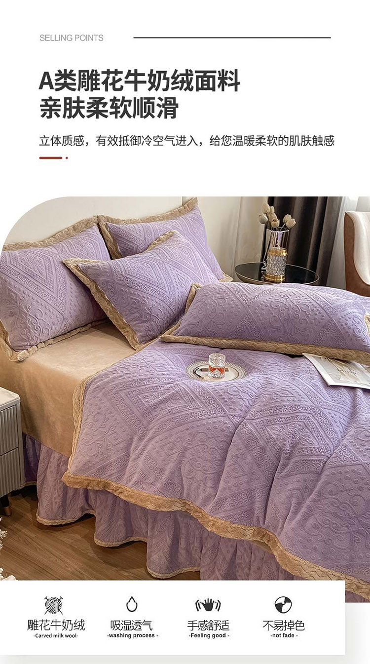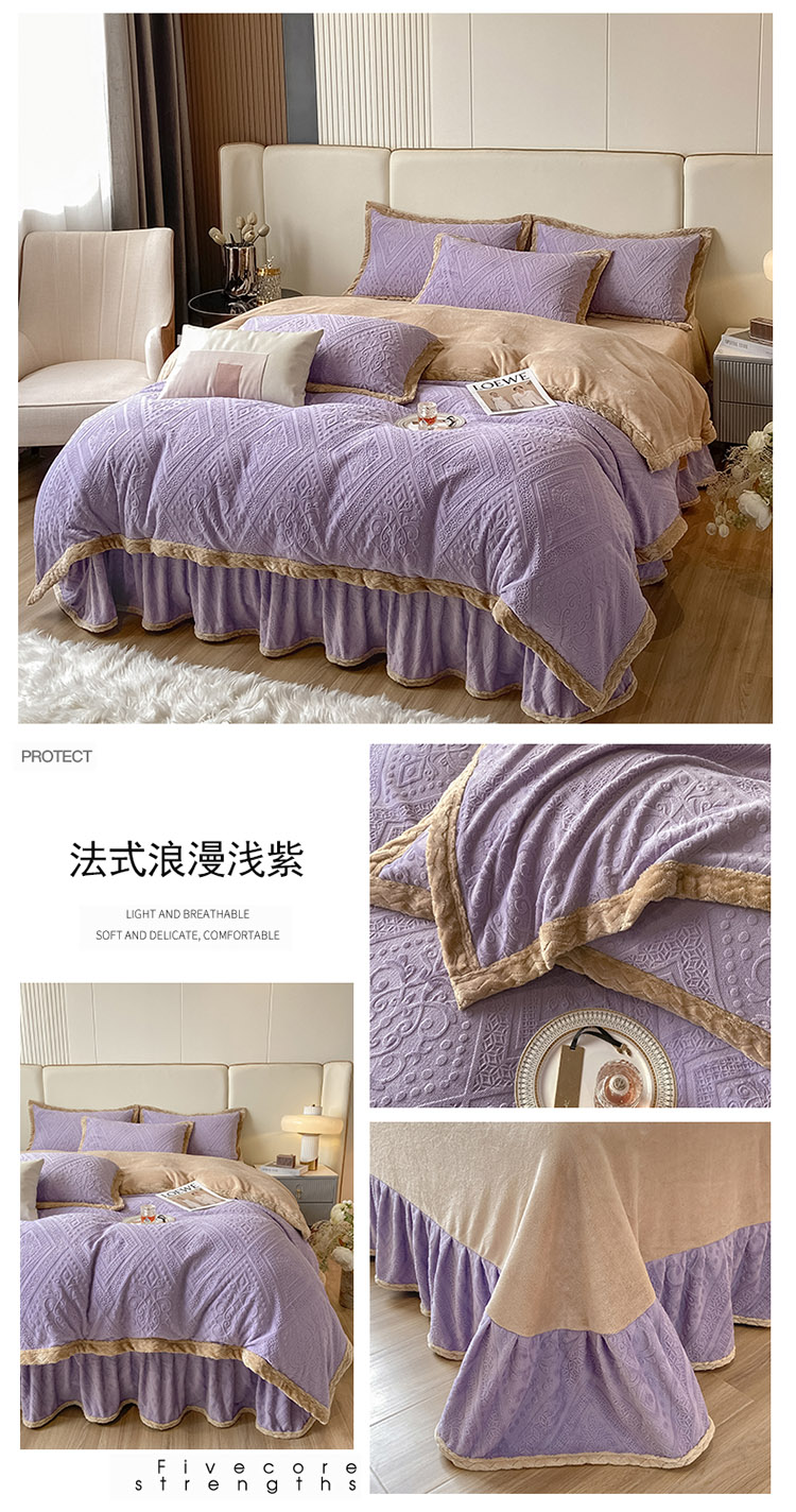 商品名称:铠畅 2022新款A类烂花牛奶绒床裙四件套 法式浪漫浅紫