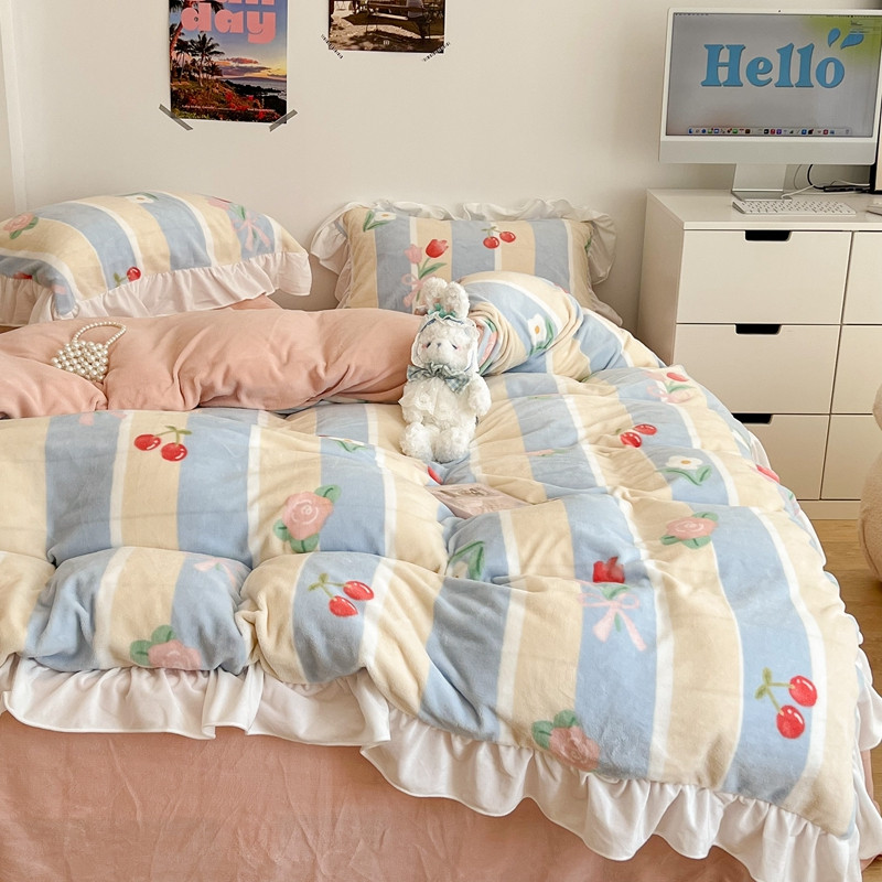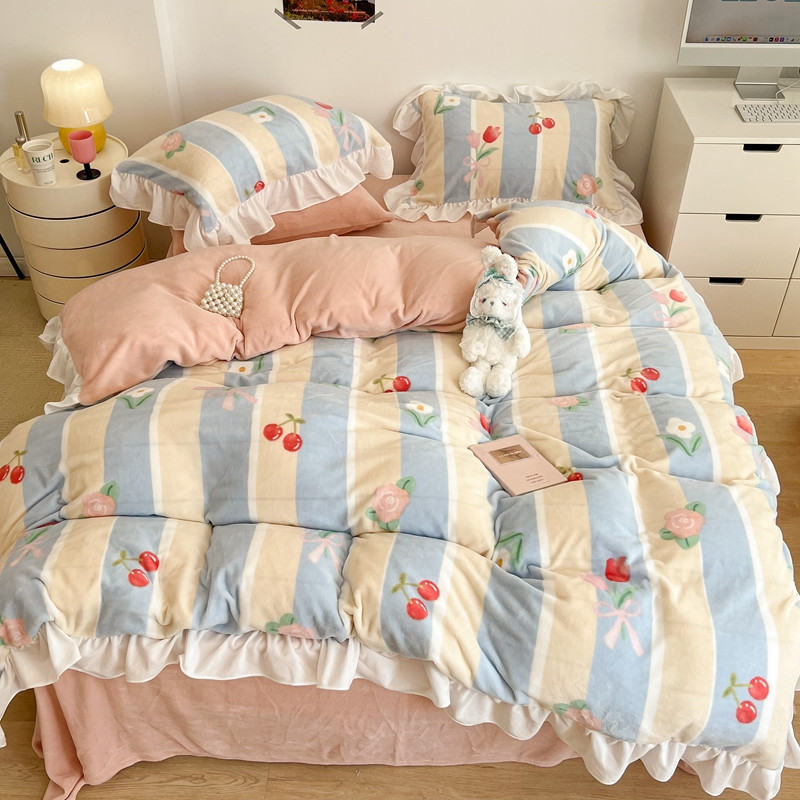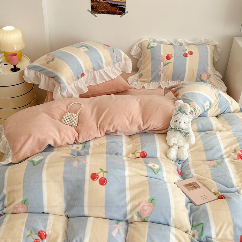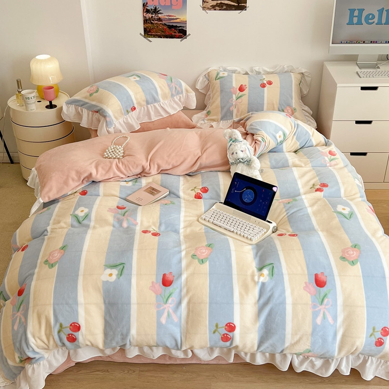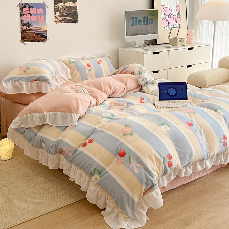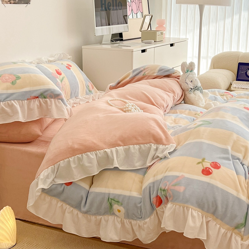 昔可 2022新款花边牛奶绒四件套 竖条玫瑰花