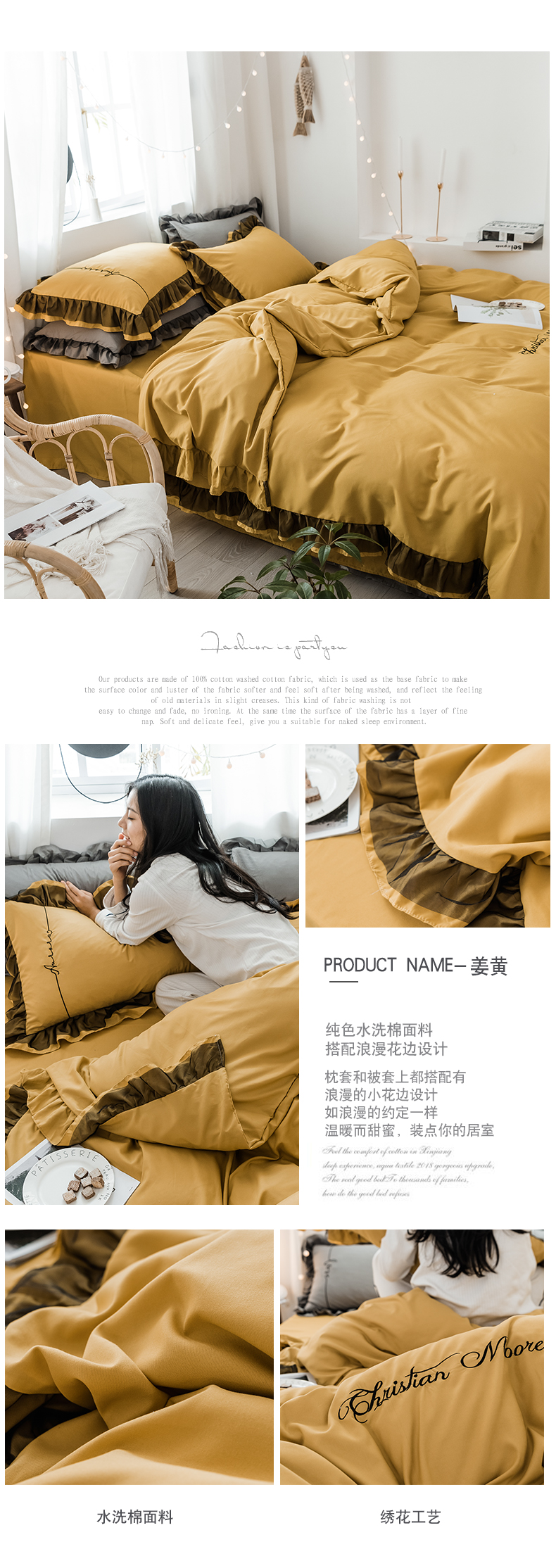 商品名称:苏木年华2023新款水洗棉蕾丝刺绣四件套 姜黄