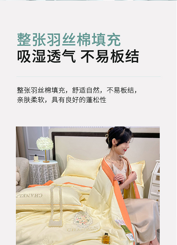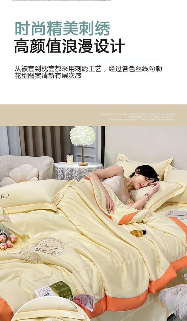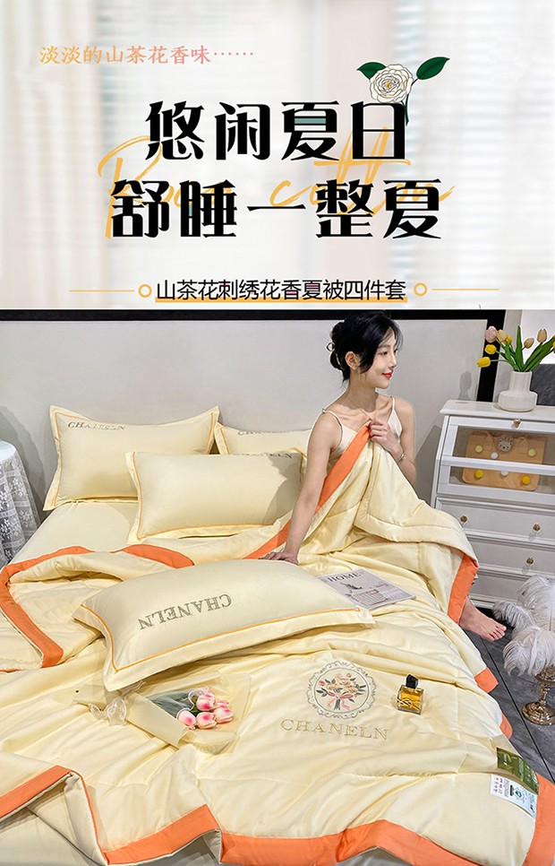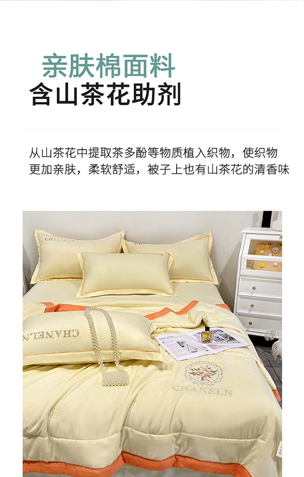 商品名称:2023苏米娜刺绣山茶花香夏被四件套天丝棉麻双层纱磨毛纯棉夏凉空调夏被 镜中花-米黄