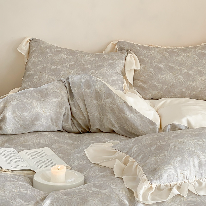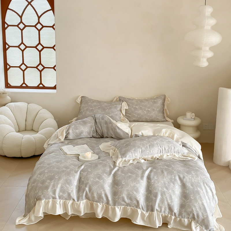 若未家居 2023新款50S兰精天丝法式床裙款四件套-风格一 夏谧月牙灰