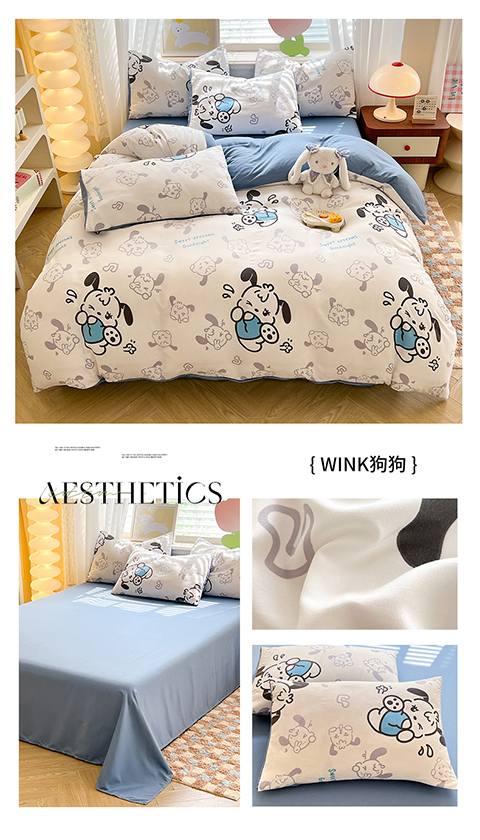 (总)妖妖家纺 2025新款高克重牛奶绒三丽鸥大版四件套,wink玉桂狗,豹纹kitty,呆萌帕恰狗,呆萌kitty,飞行美乐蒂,开心布丁狗,库洛米大厨,甜酷库洛米,兔兔与美乐蒂,玉桂狗郊游