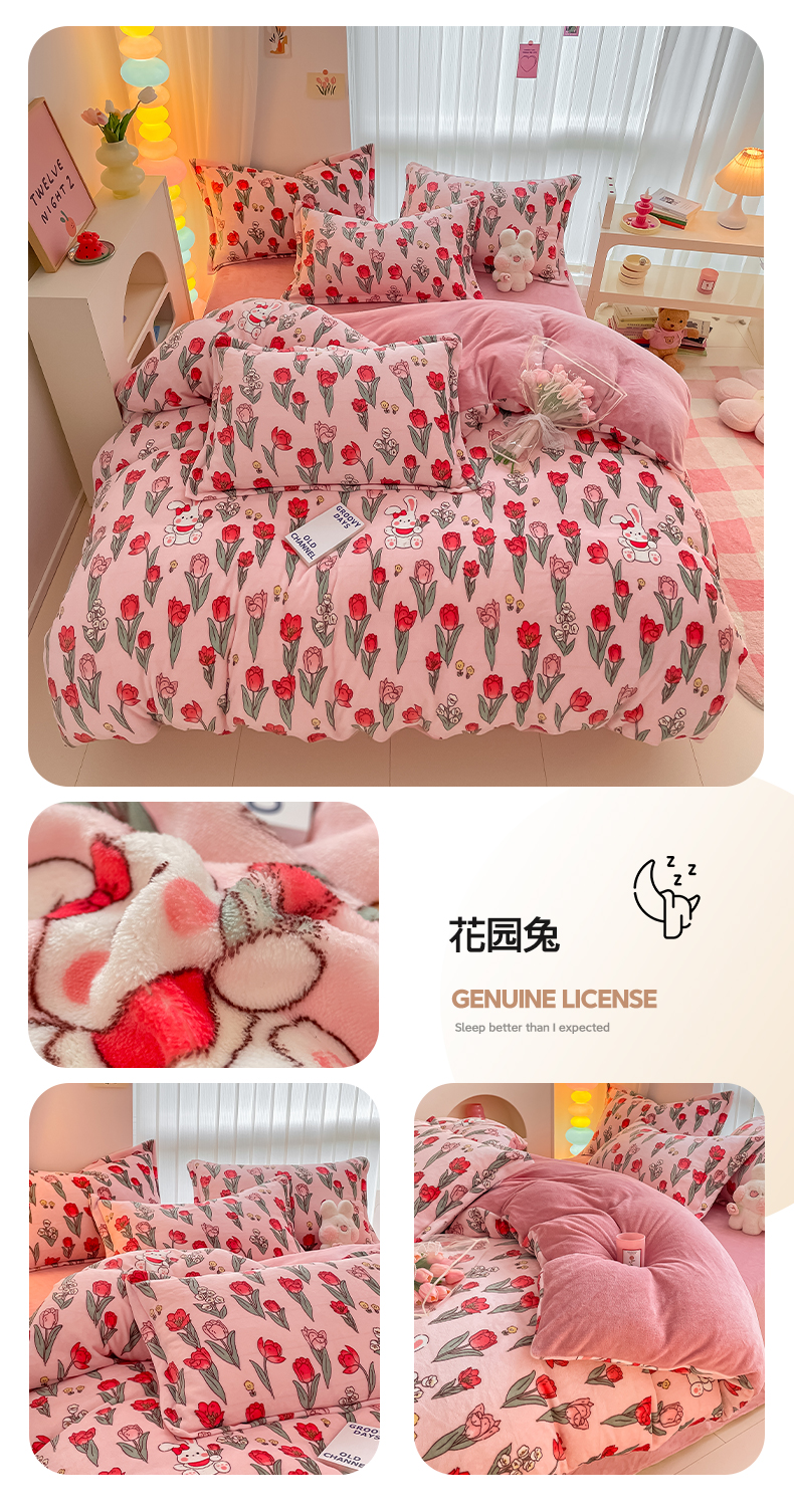 商品名称:莱米家纺 2023新款小版牛奶绒印花四件套 花园兔
