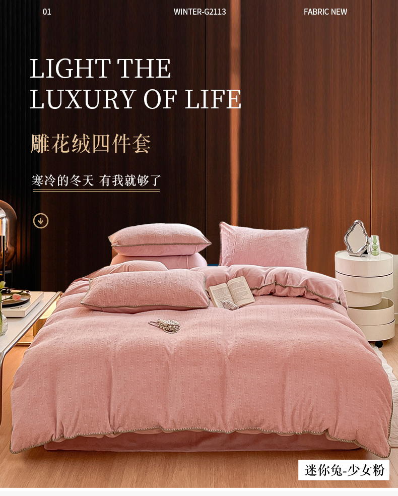当前位置: 91家纺网 > 商品网购 > 床品套件 > 四件套 > 牛奶绒四件套 > 金爱家 2023新款半消光牛奶绒立体雕花牛奶绒四件套 迷你兔-少女粉
