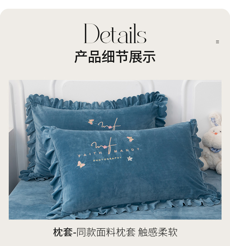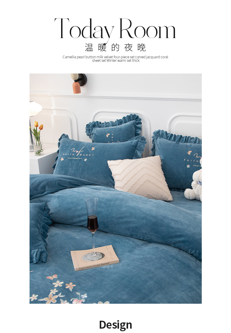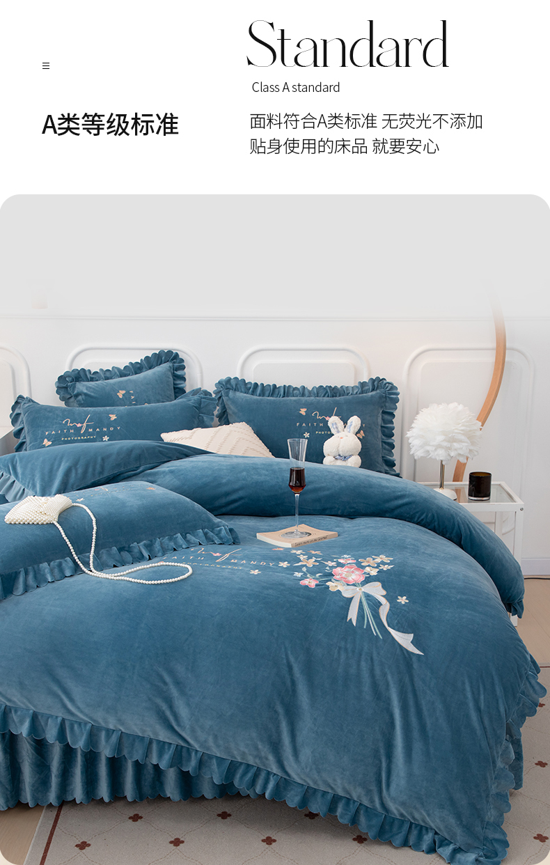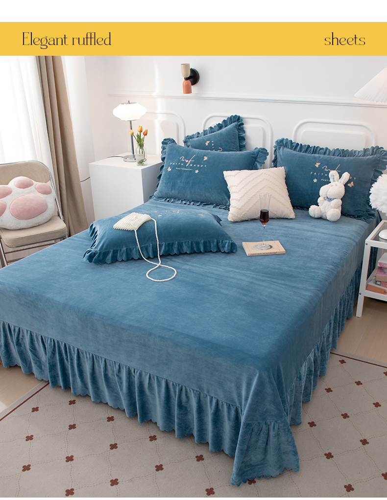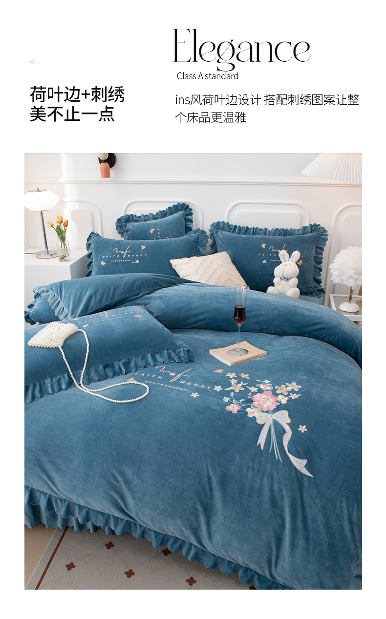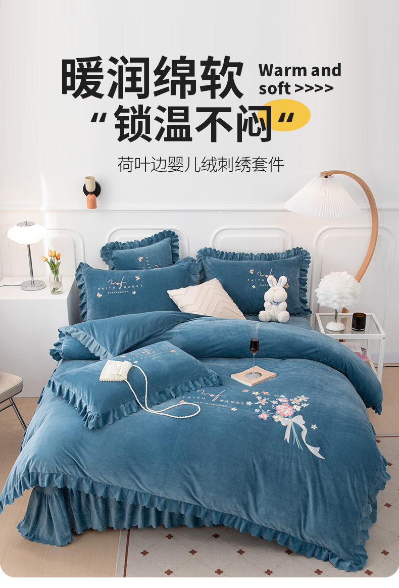 床品套件 > 优姿家纺 2024新品8.5斤德芙绒韩版床裙绣花保暖四件套 今生有约宝石兰