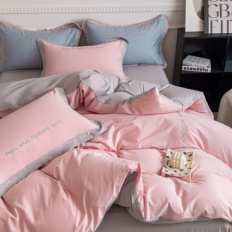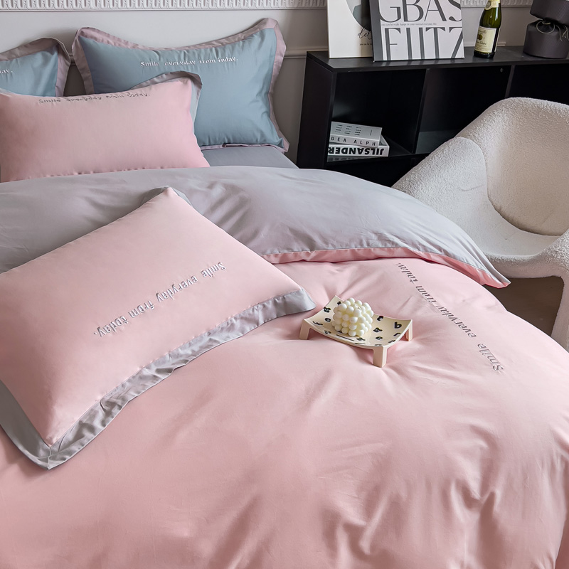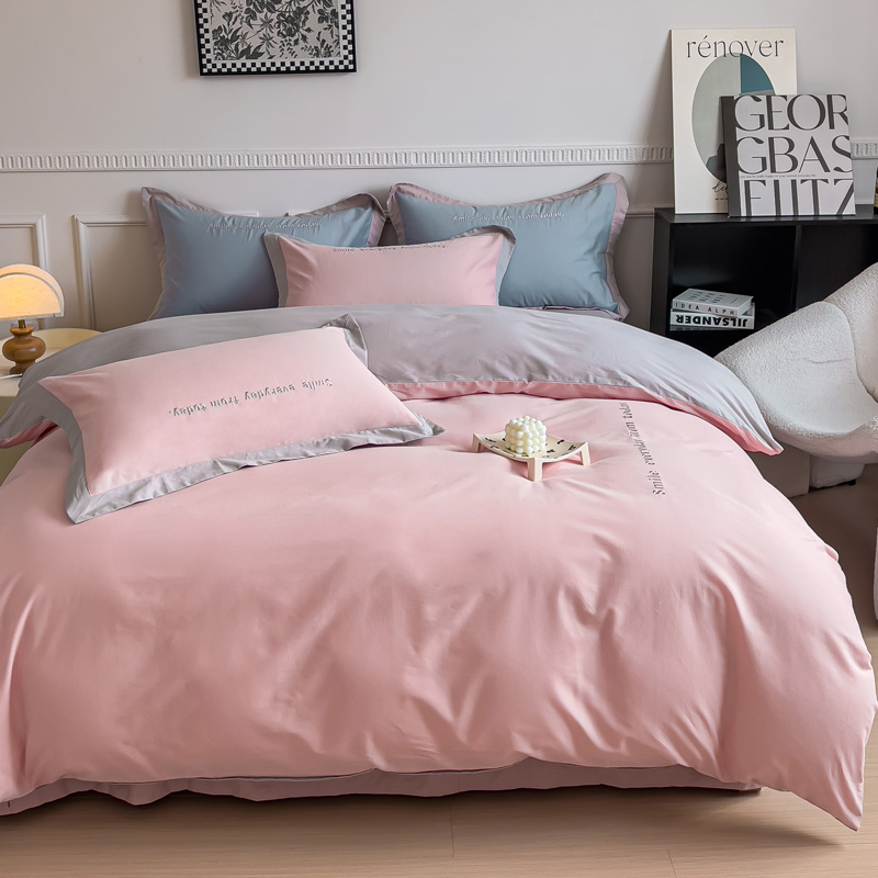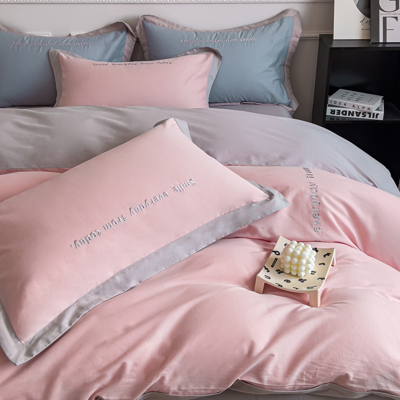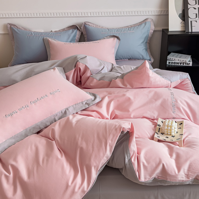 (总)嘉汀兰 2023新款60支全棉磨毛绣花撞色轻奢四件套—暮里,粉色,红灰色,芥绿色,浅灰色,深青色