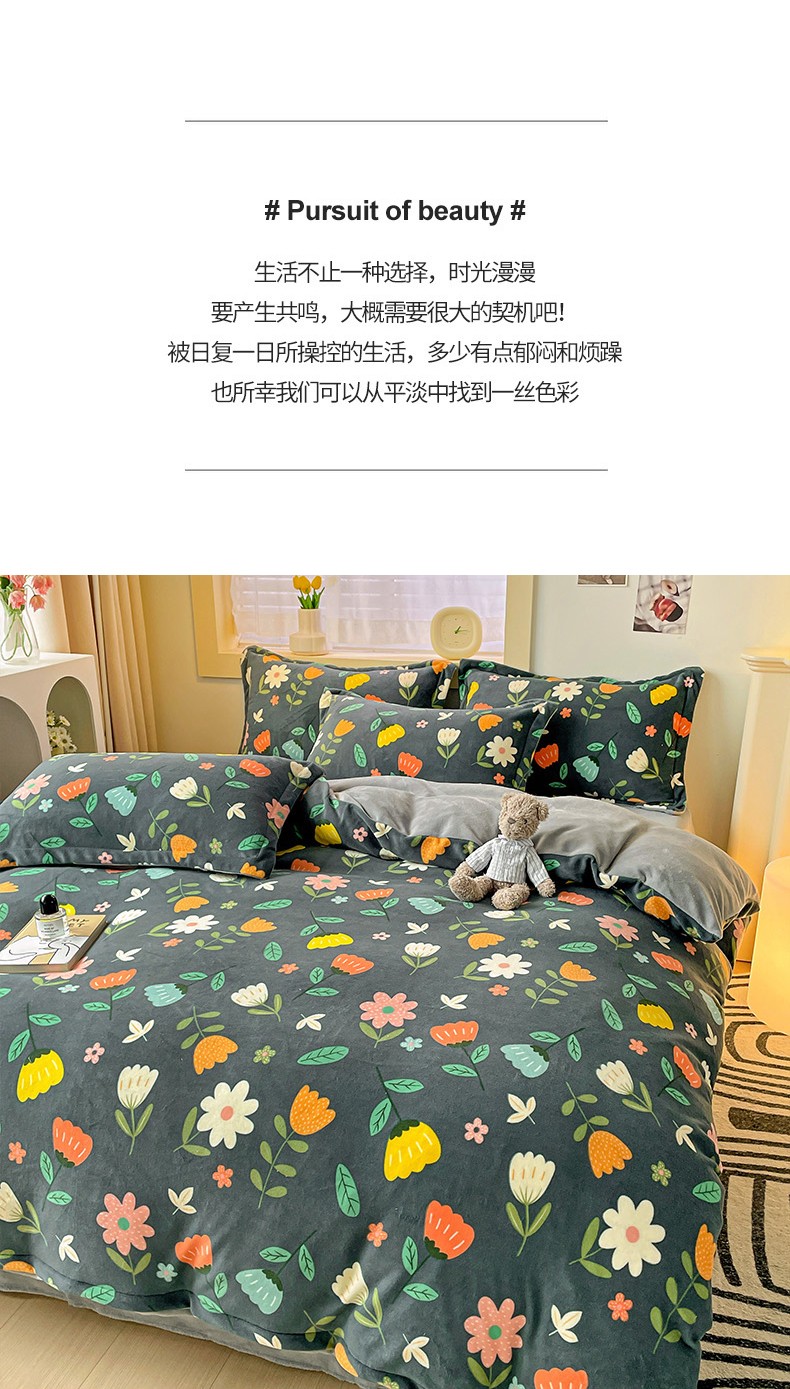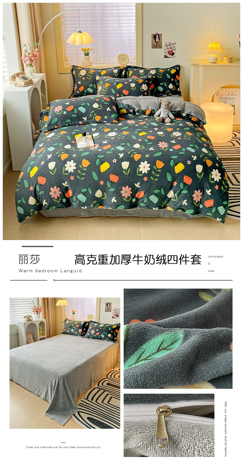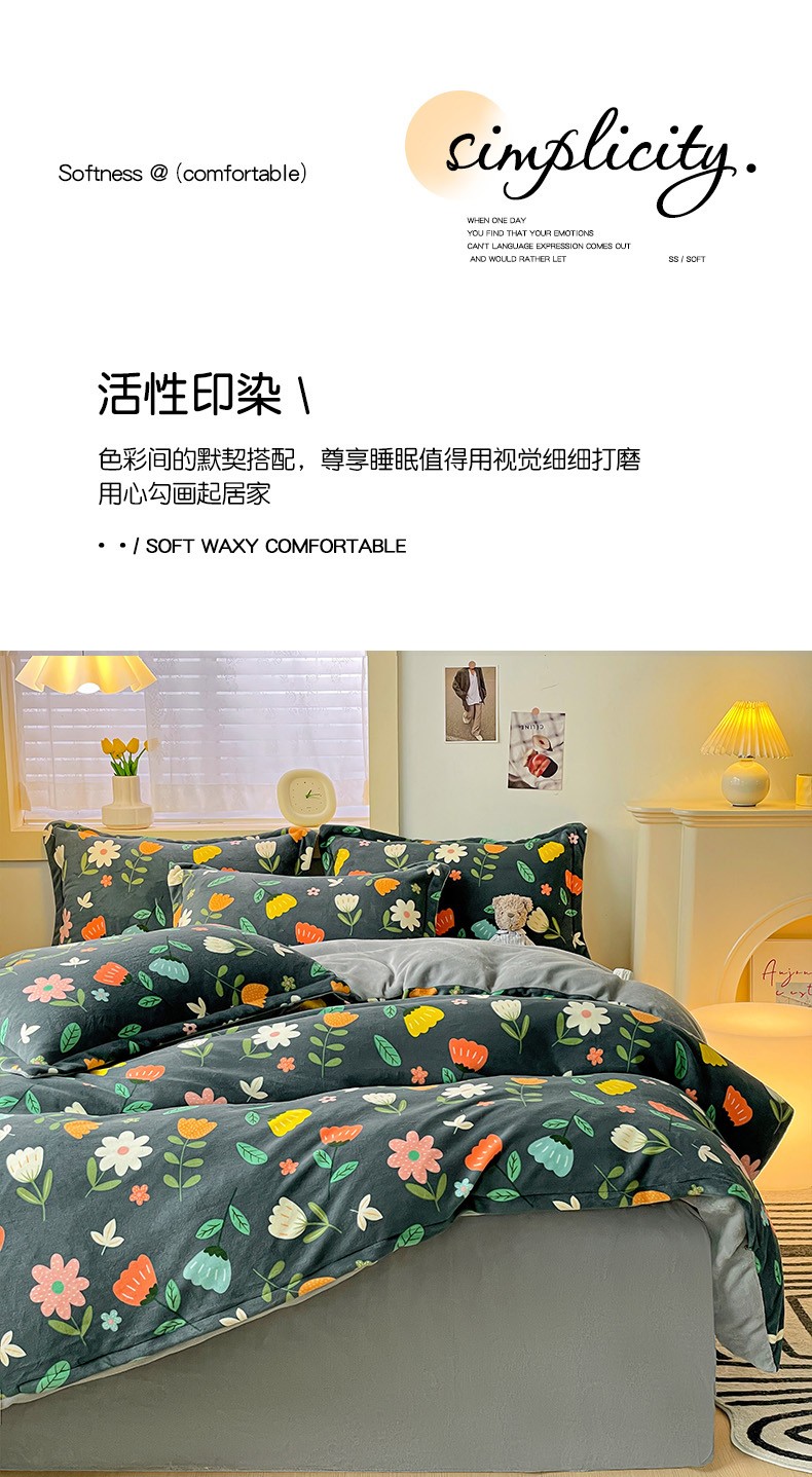 当前位置: 91家纺网 > 商品网购 > 床品套件 > 四件套 > 牛奶绒四件套 > 畅畅家纺 2023新款活性印花小清新AB版加厚高克重法莱绒牛奶绒四件套 丽莎