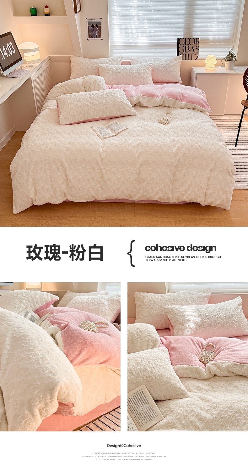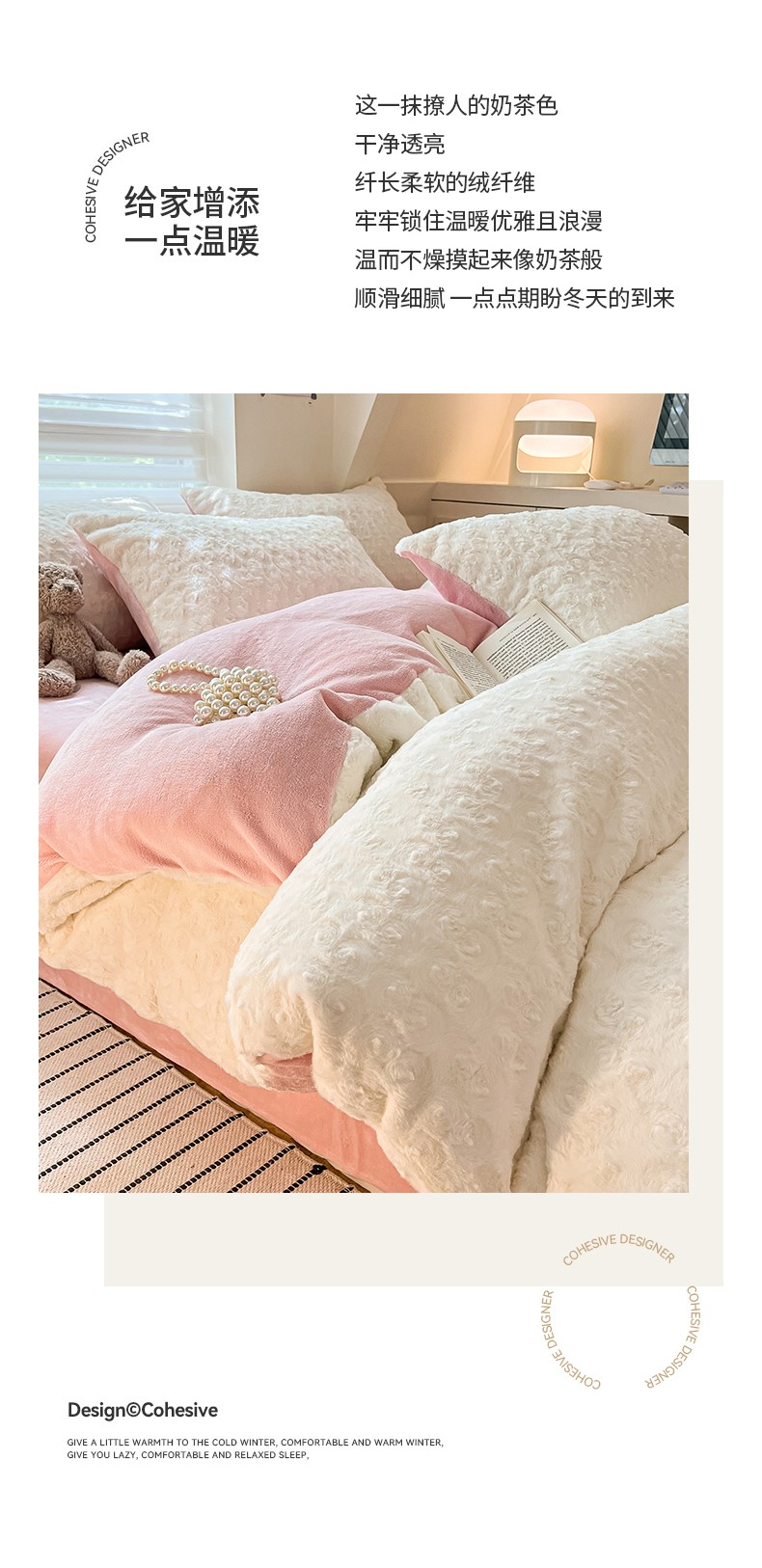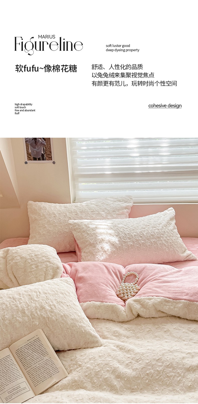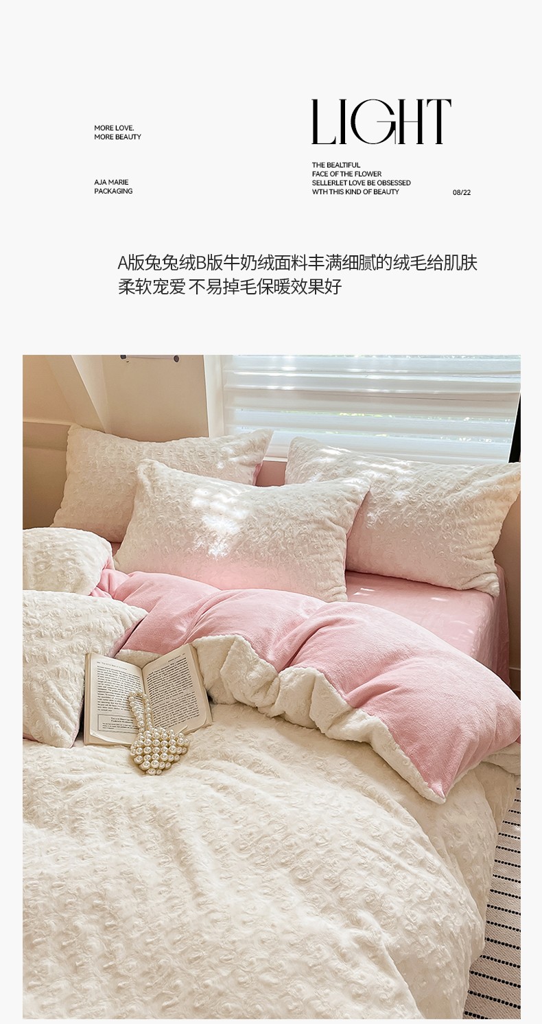 商品名称:澳梵 2023新款立体压花兔兔绒牛奶绒四件套 玫瑰-粉白