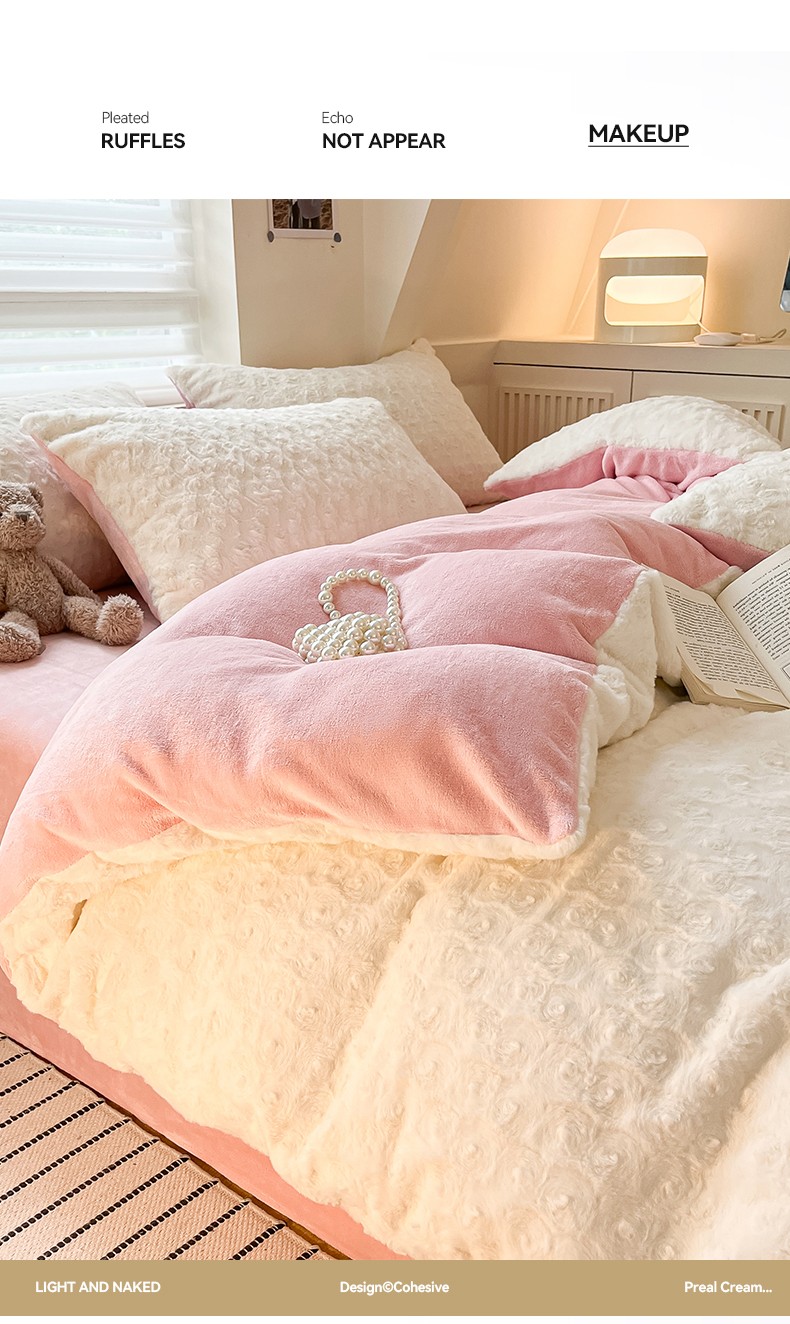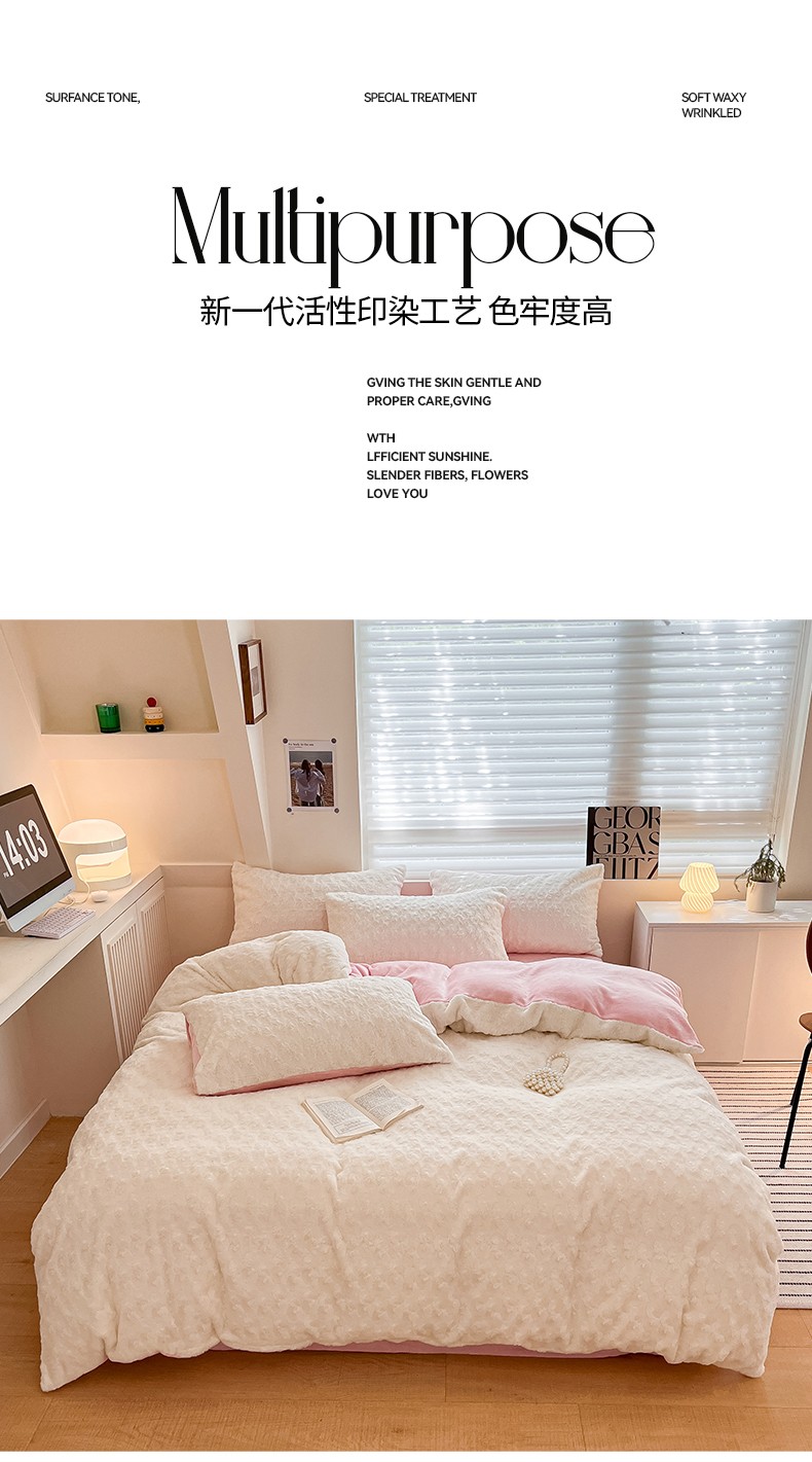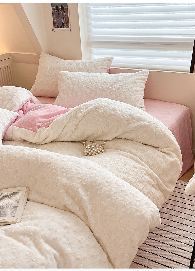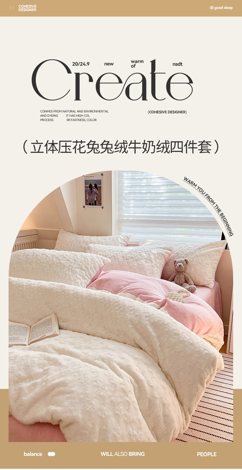 商品名称:澳梵 2023新款立体压花兔兔绒牛奶绒四件套 玫瑰-粉白