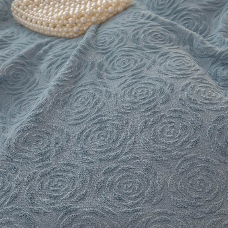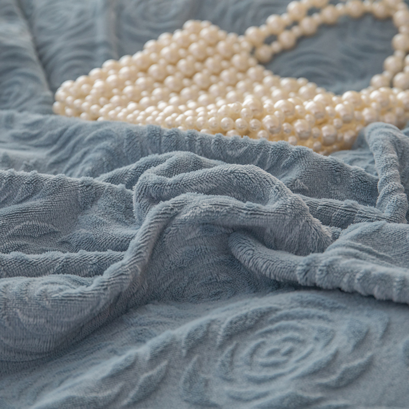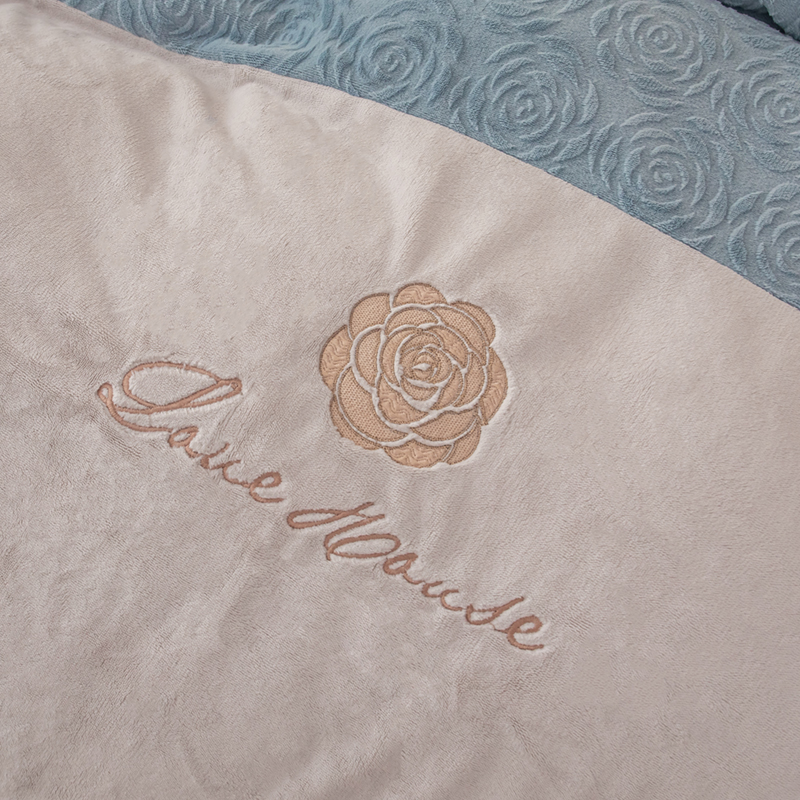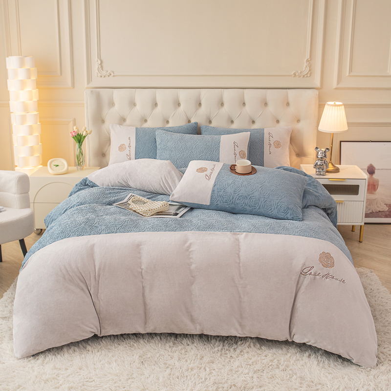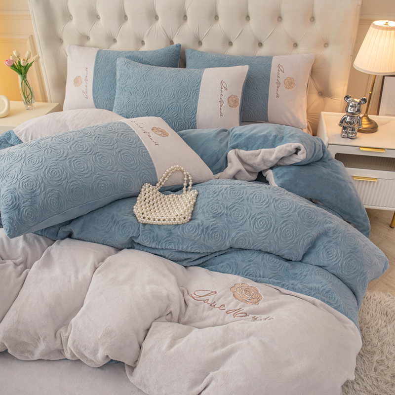 商品名称:好阁 2023新款法式刺绣小香风雕花双拼牛奶绒四件套 水冰蓝+流沙灰