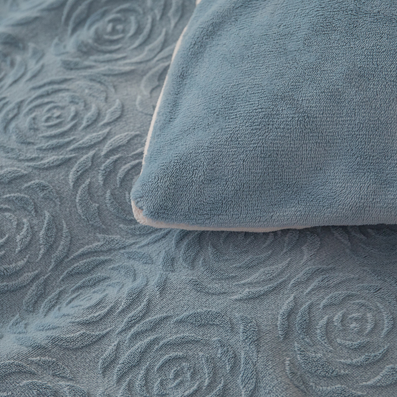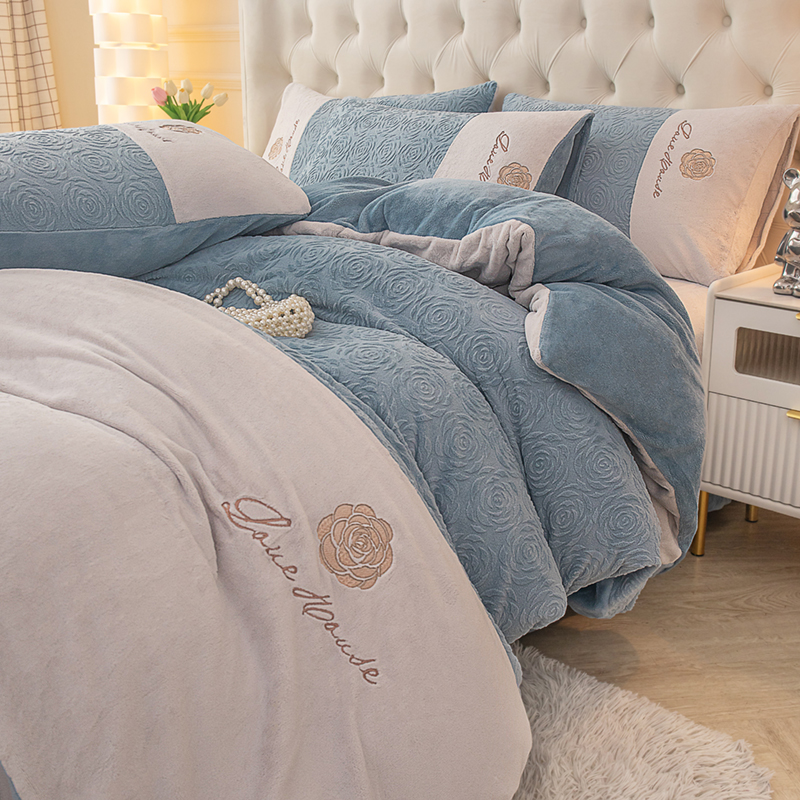 好阁 2023新款法式刺绣小香风雕花双拼牛奶绒四件套 水冰蓝+流沙灰
