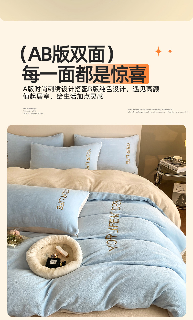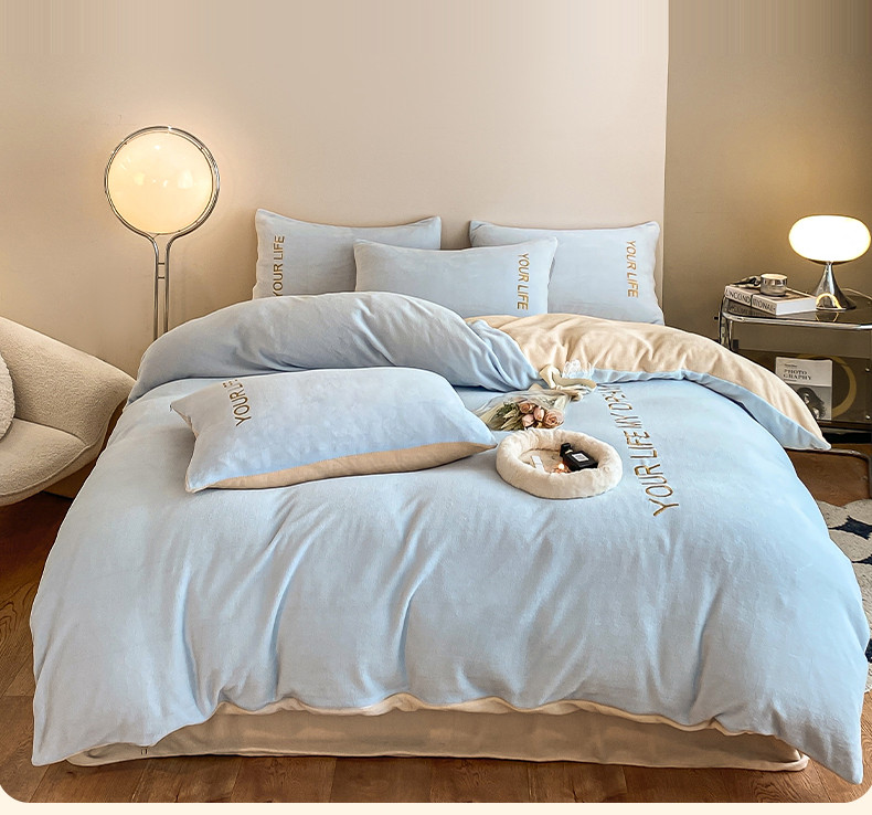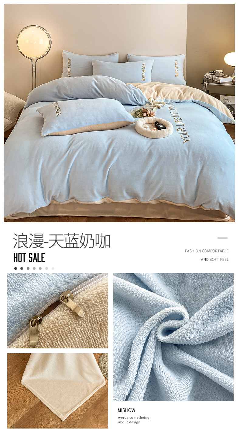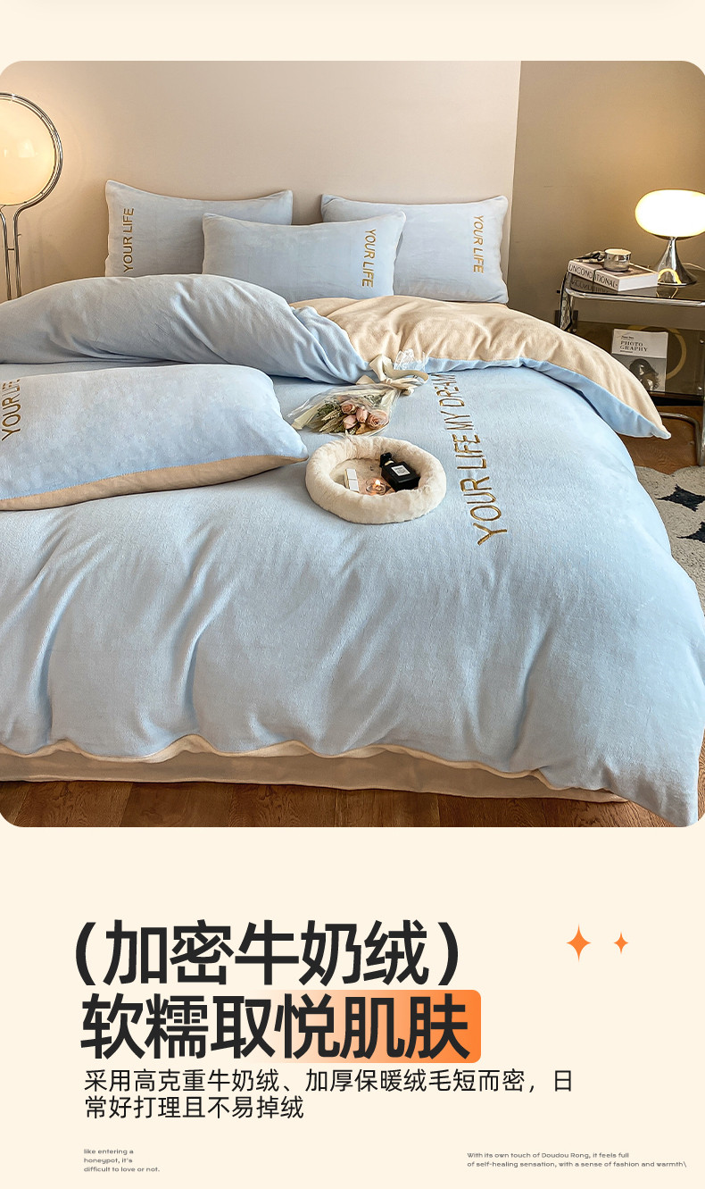 义博 2025新款牛奶绒刺绣四件套-浪漫系列 浪漫-天蓝奶咖