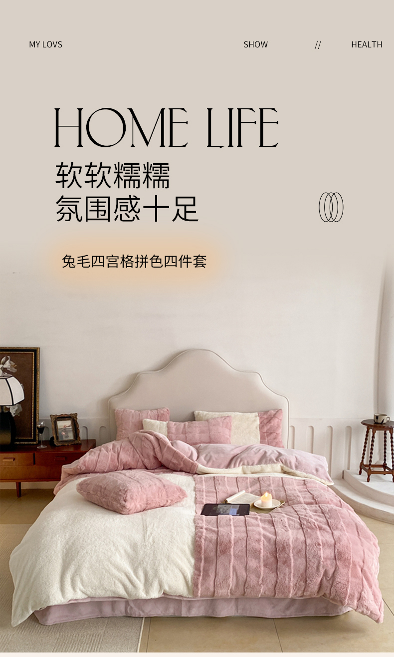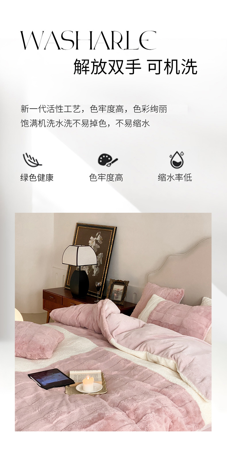(总)潘朵拉 2023新款兔毛四宫格极有家小红书风格拼色牛奶绒四件套,梵希(豆沙),梵希(粉),梵希(灰),梵希(蓝),梵希(绿),梵希(奶咖)