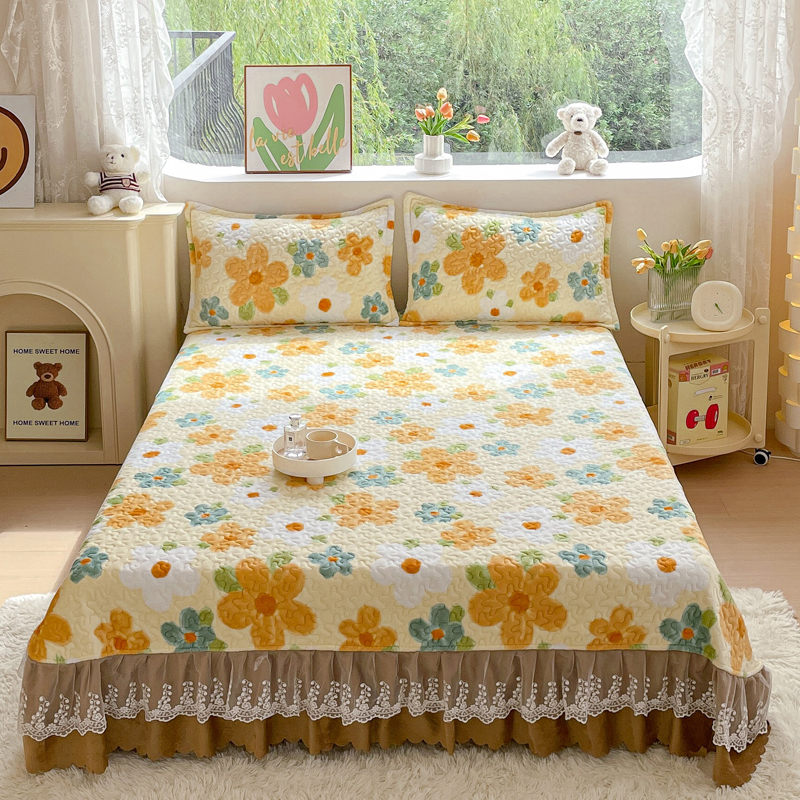 雅眠居 2023新款直播爆款牛奶绒双层蕾丝床盖夹棉床裙款 冬日暖阳
