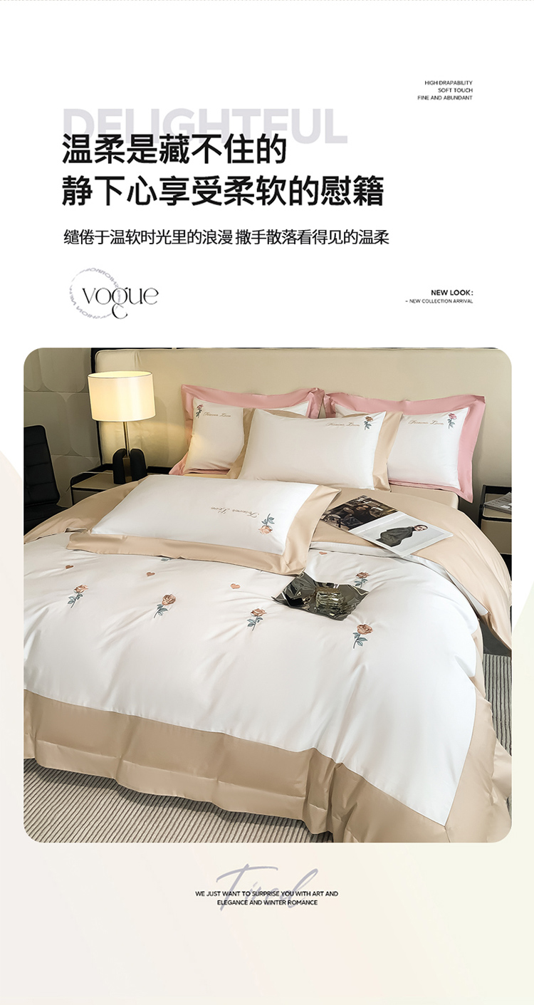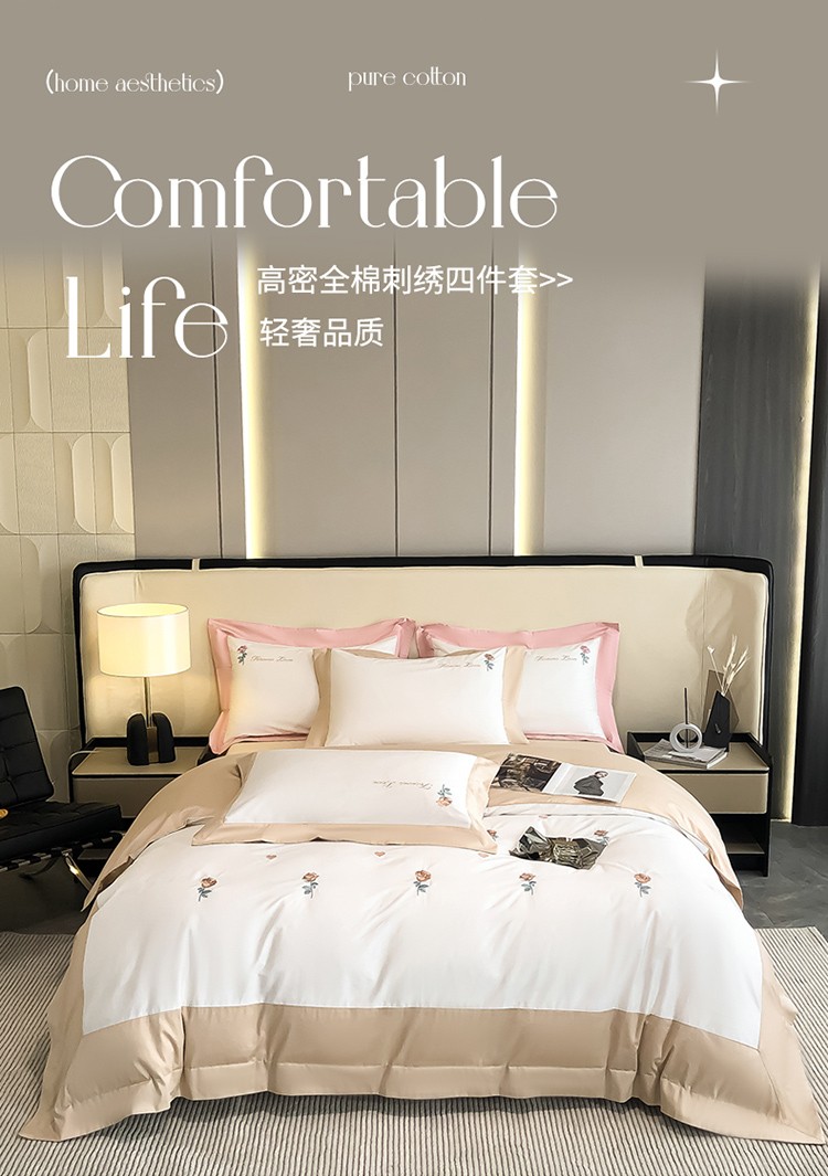 星蕴2023秋冬新款高密全棉轻奢刺绣纯棉四件套 卡其色