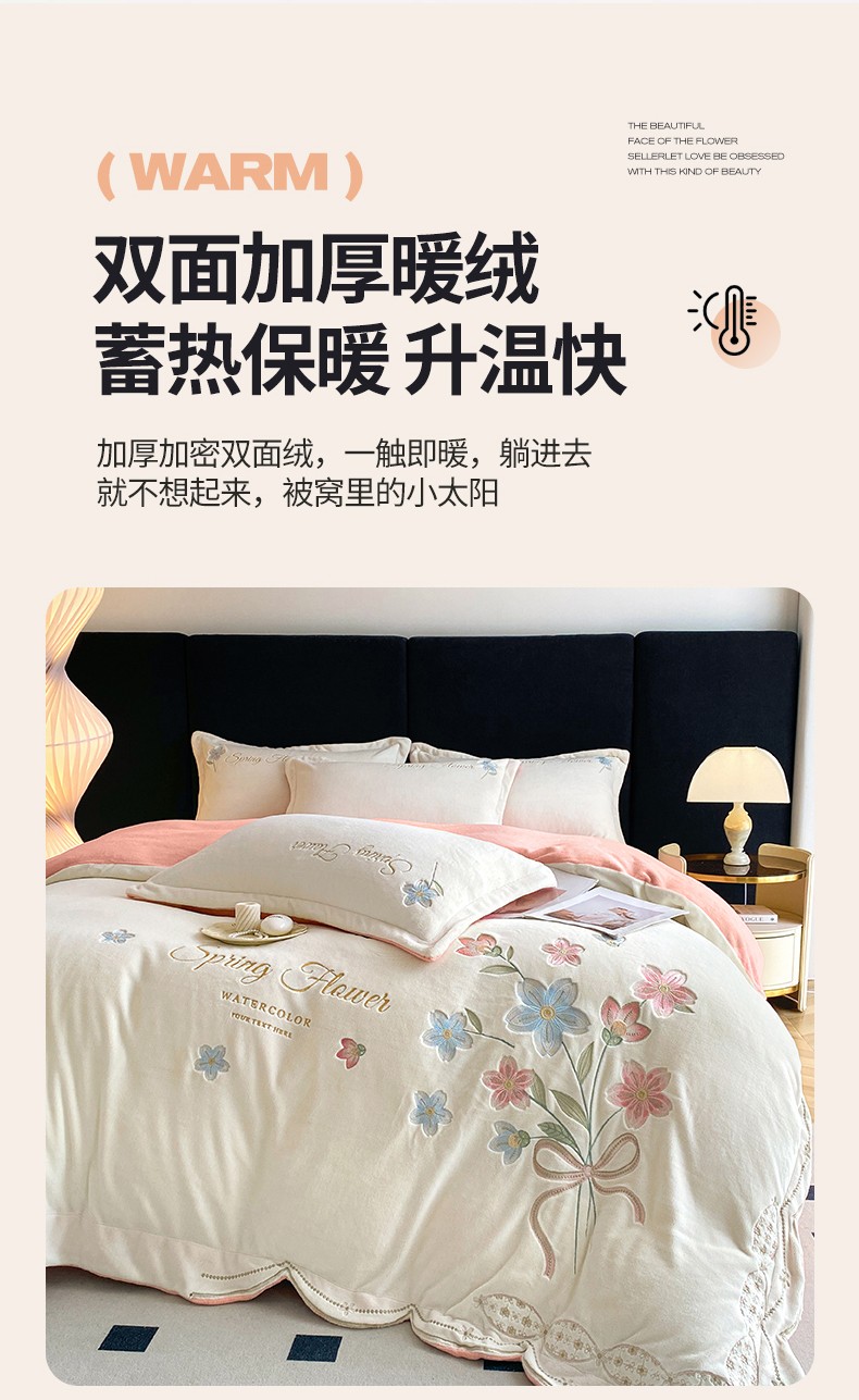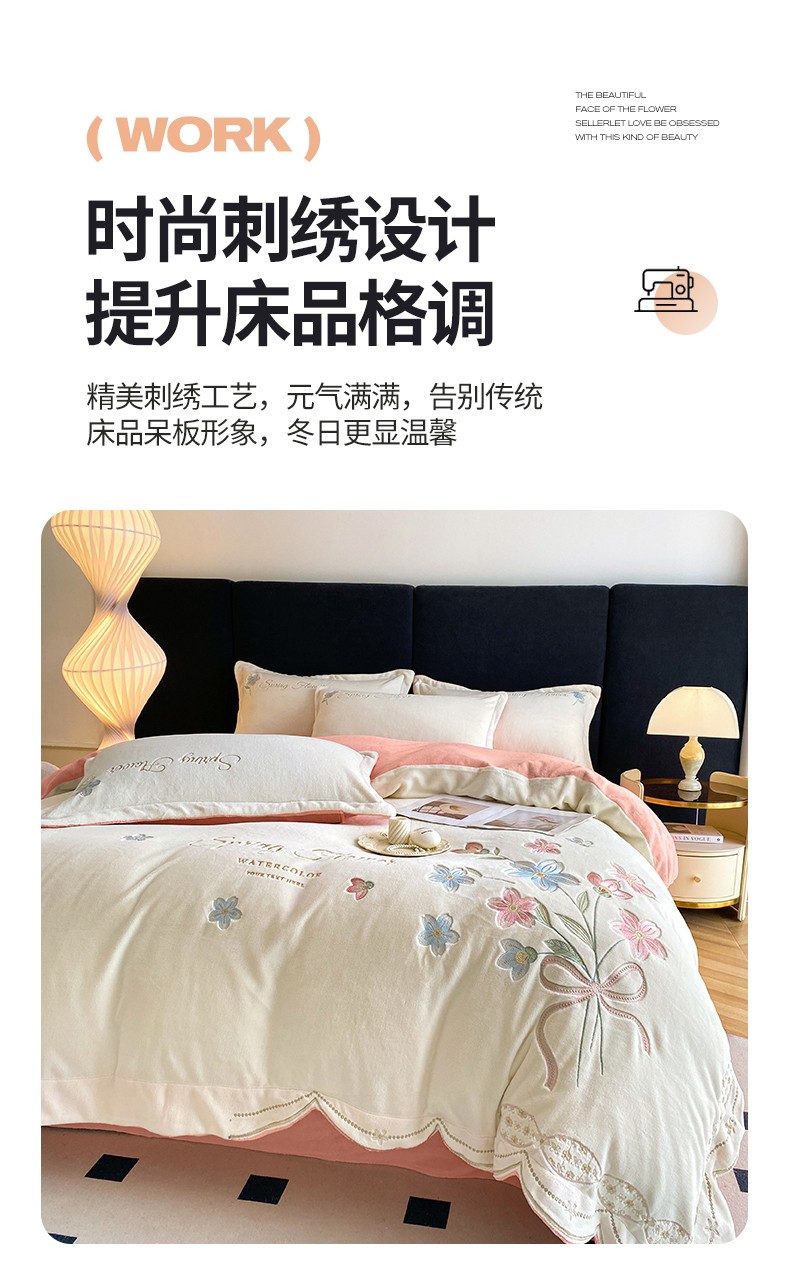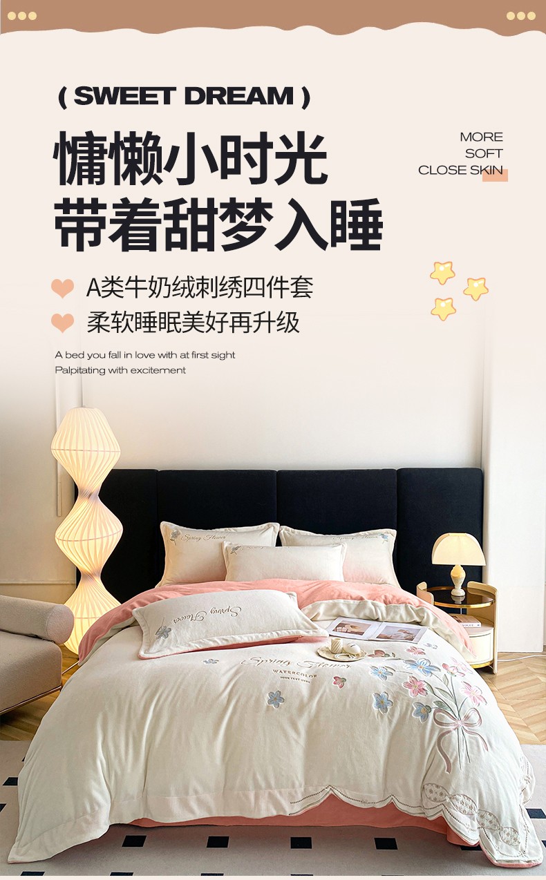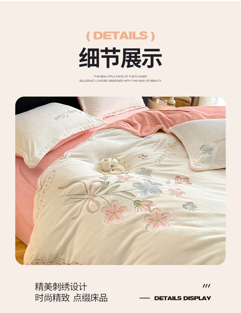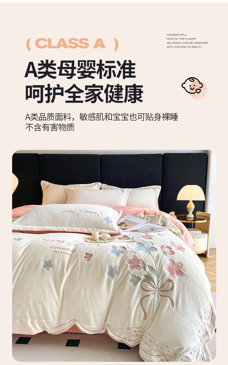 (总)爱家(原缔乐家纺) 2025新款A类高克重牛奶绒立体花刺绣四件套-花蜜,花蜜-公主粉,花蜜-天空兰,花蜜-奶昔白,花蜜-梦幻紫