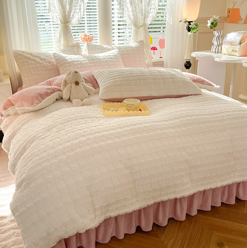 丝印良品 2023新款高克重兔绒牛奶绒四件套 月光白粉