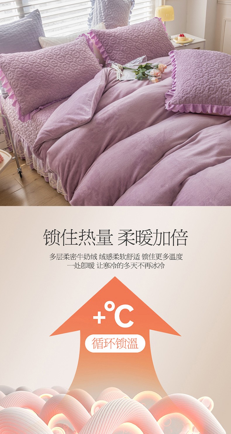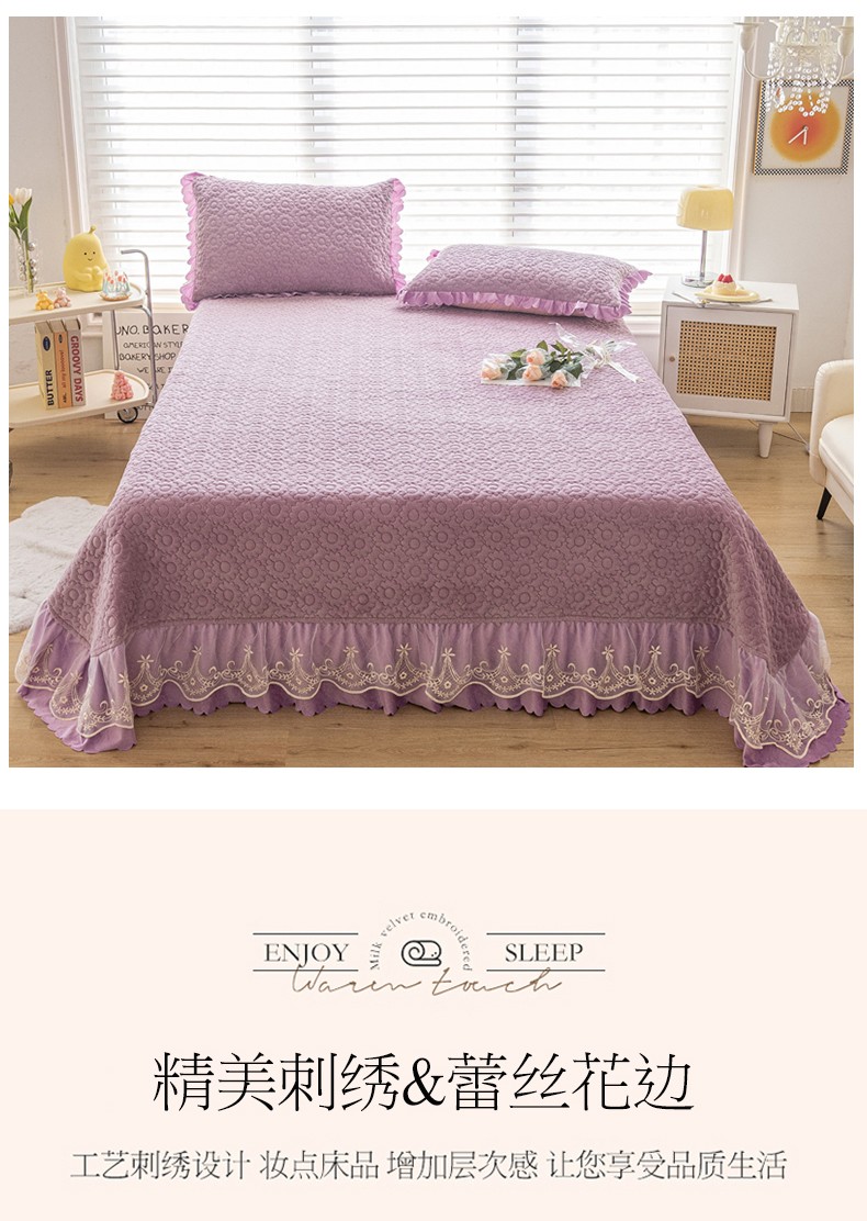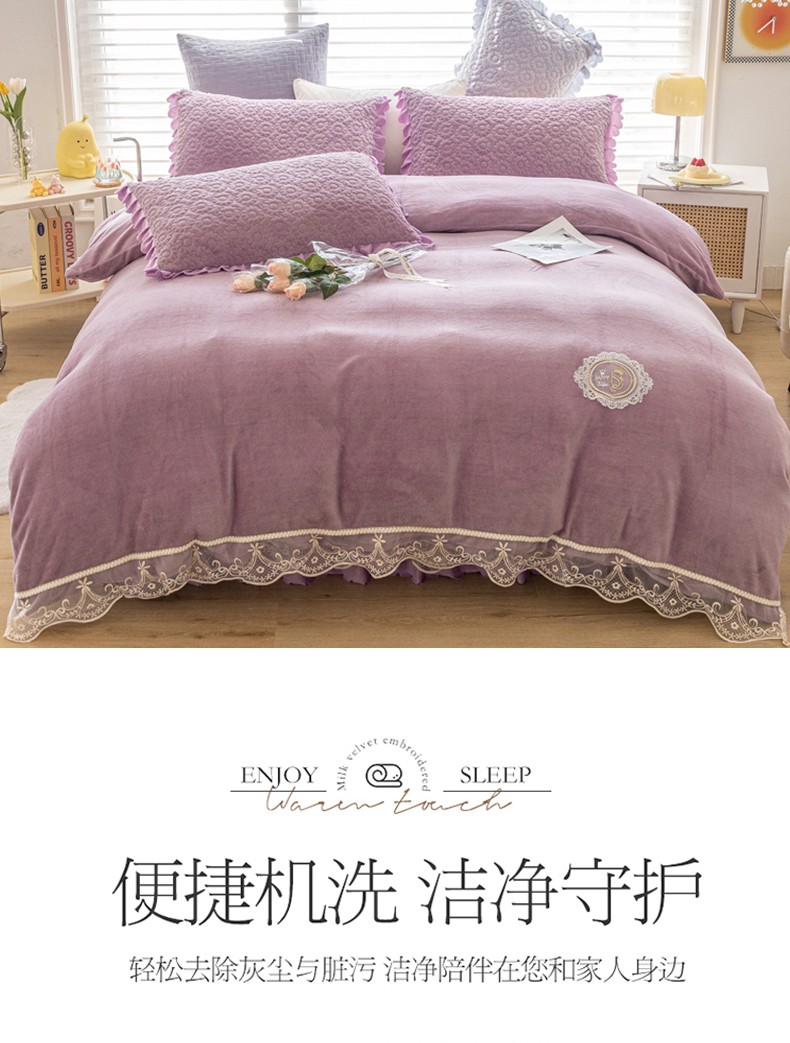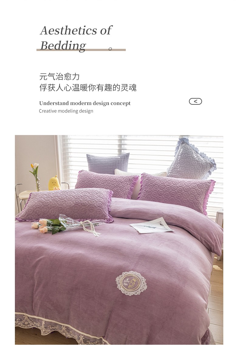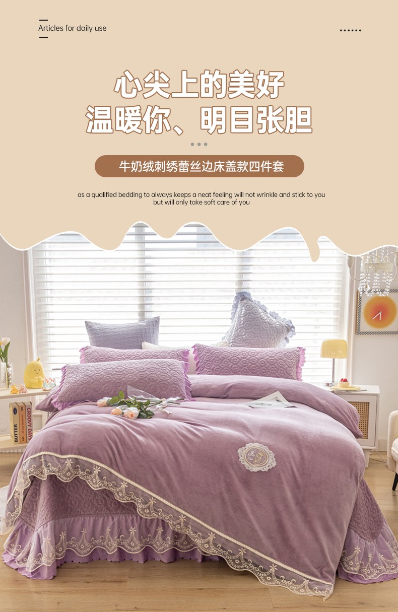 商品名称:乐嘉盈 2025新款纯色刺绣蕾丝边牛奶绒床盖款四件套 花语紫