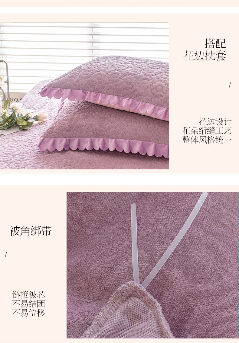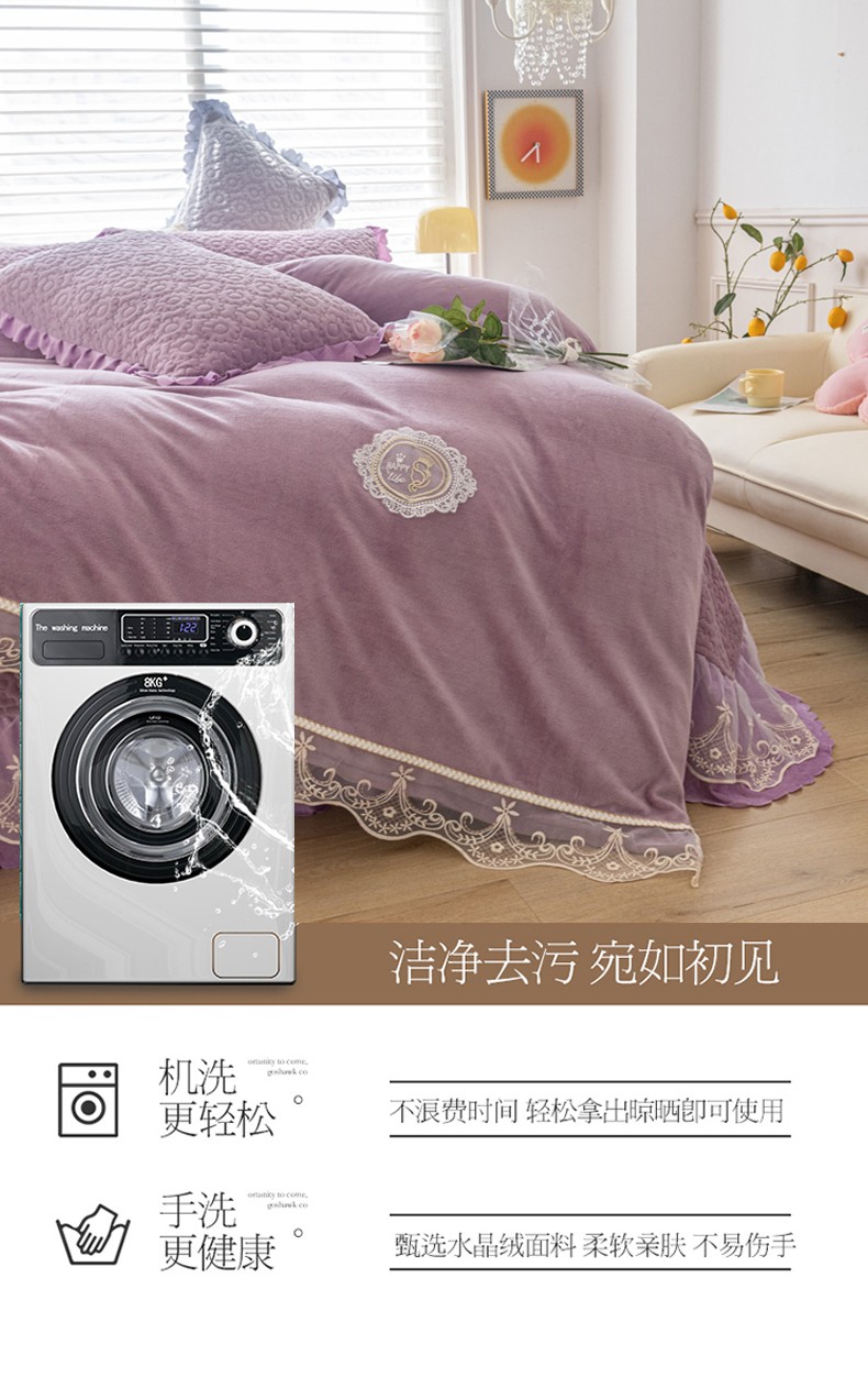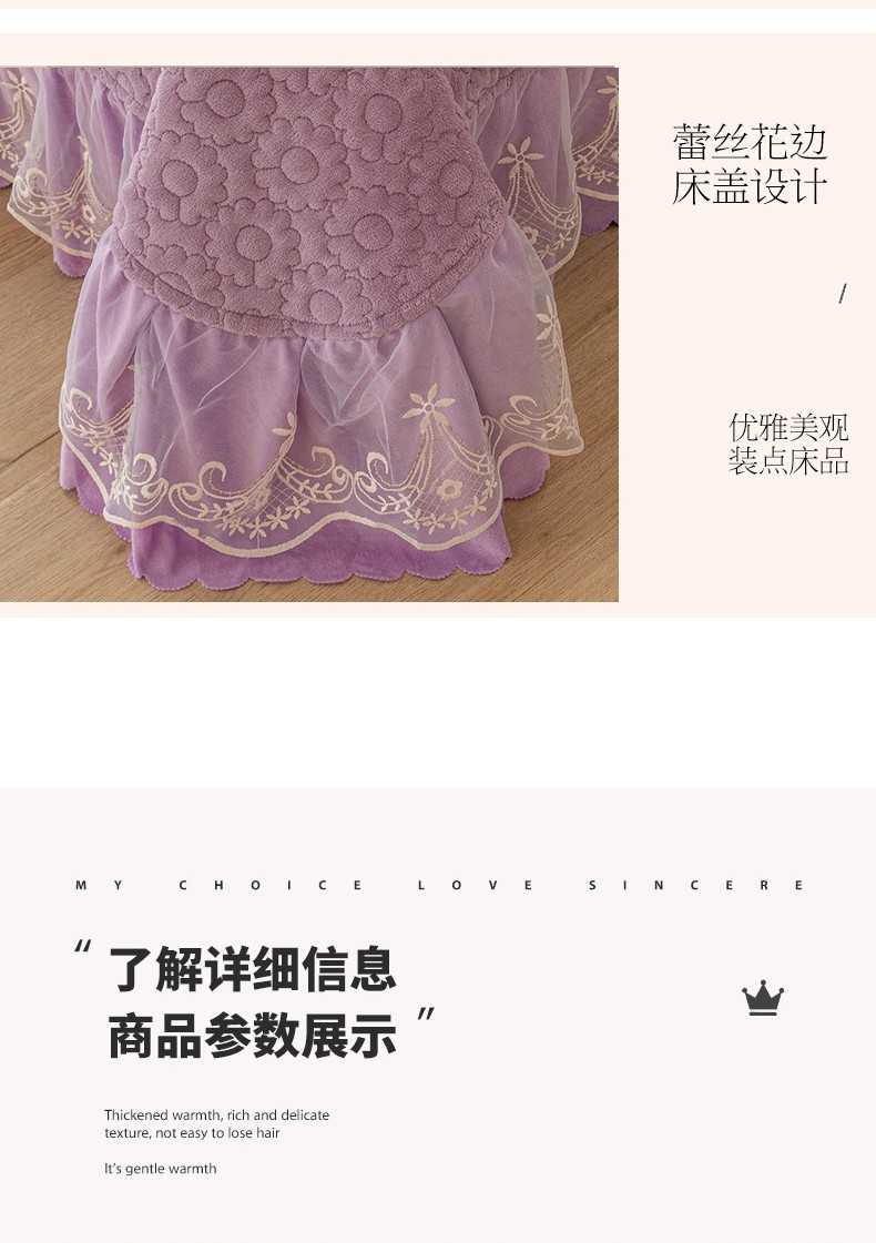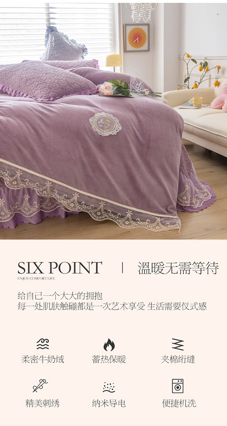 商品名称:乐嘉盈 2025新款纯色刺绣蕾丝边牛奶绒床盖款四件套 花语紫