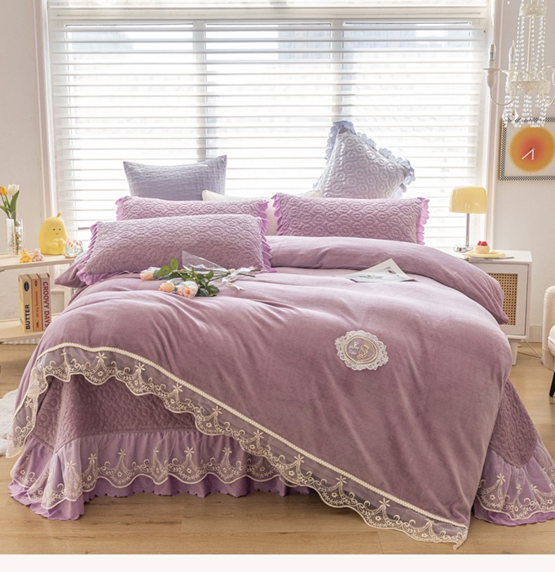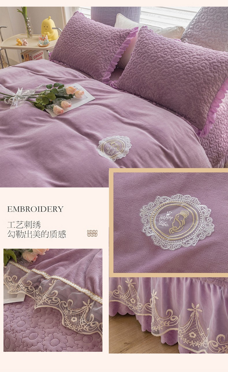 乐嘉盈 2025新款纯色刺绣蕾丝边牛奶绒床盖款四件套 花语紫