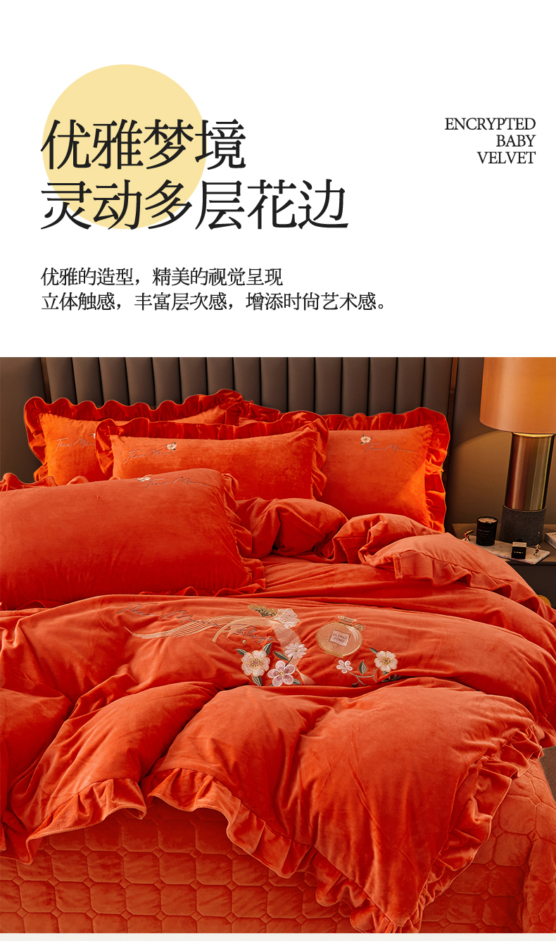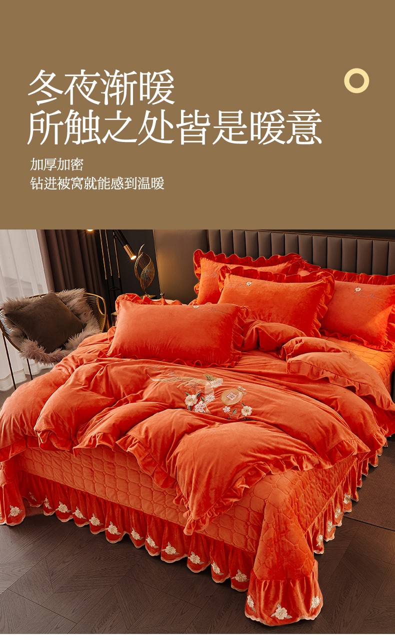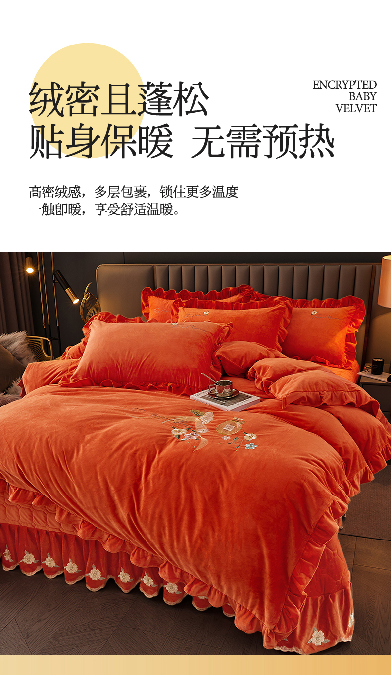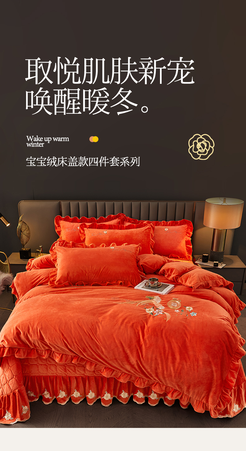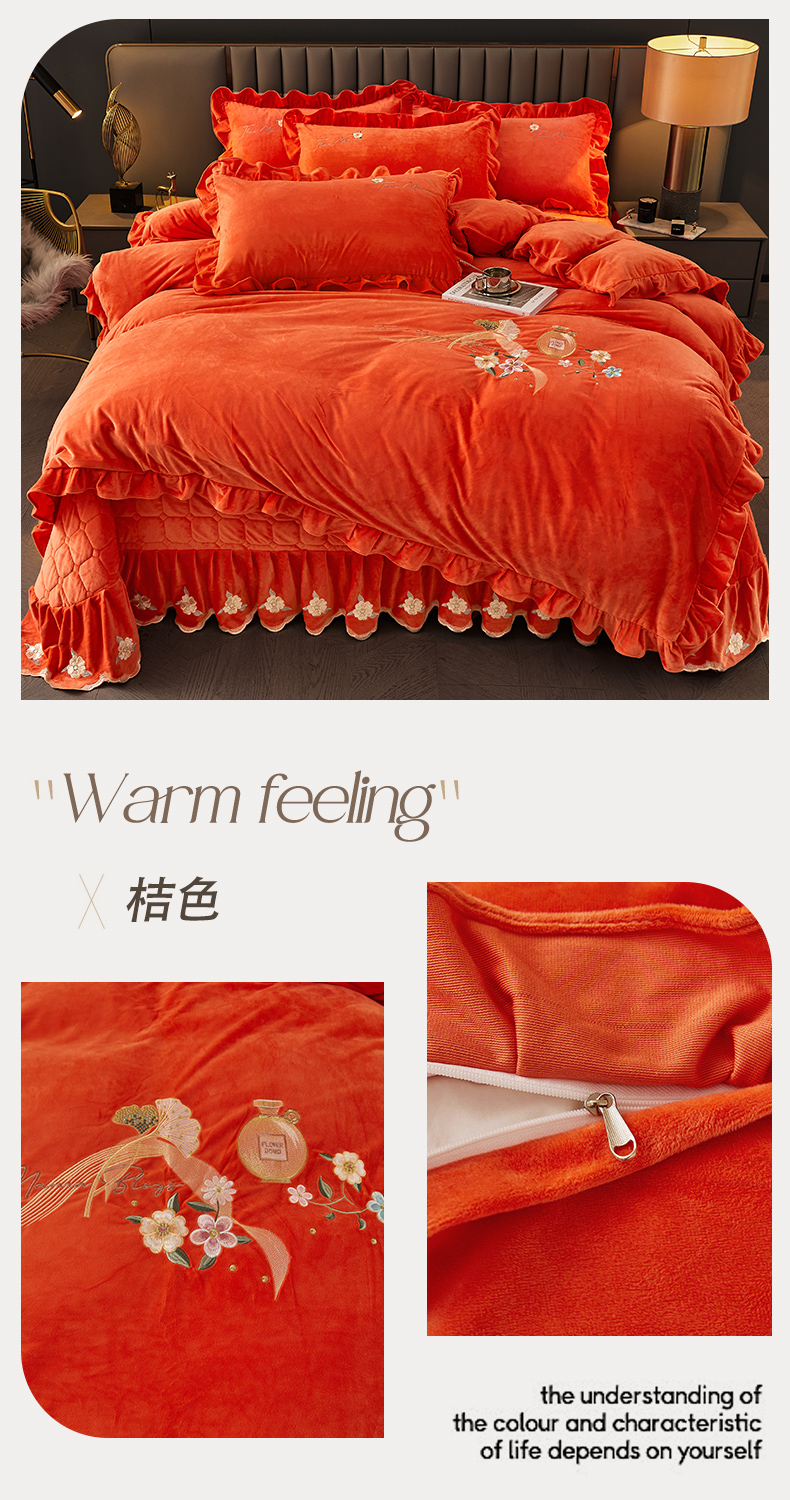 当前位置: 91家纺网 > 商品网购 > 床品套件 > 四件套 > 宝宝绒四件套 > 恒爱家纺 2023新款温暖舒适加密宝宝绒床盖四件套-邂逅系列 桔色