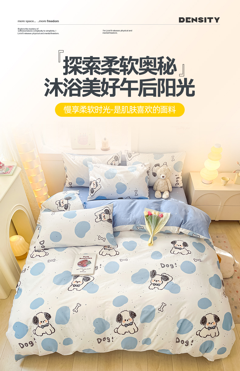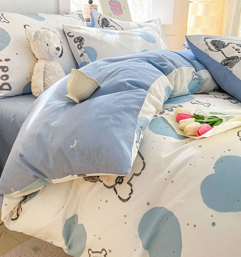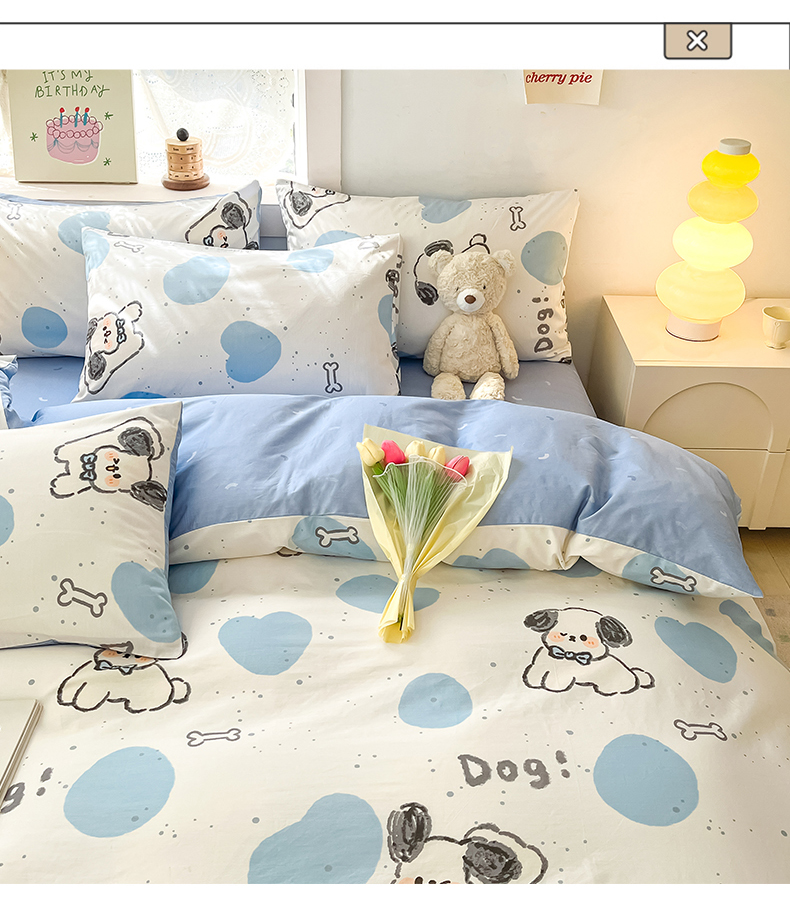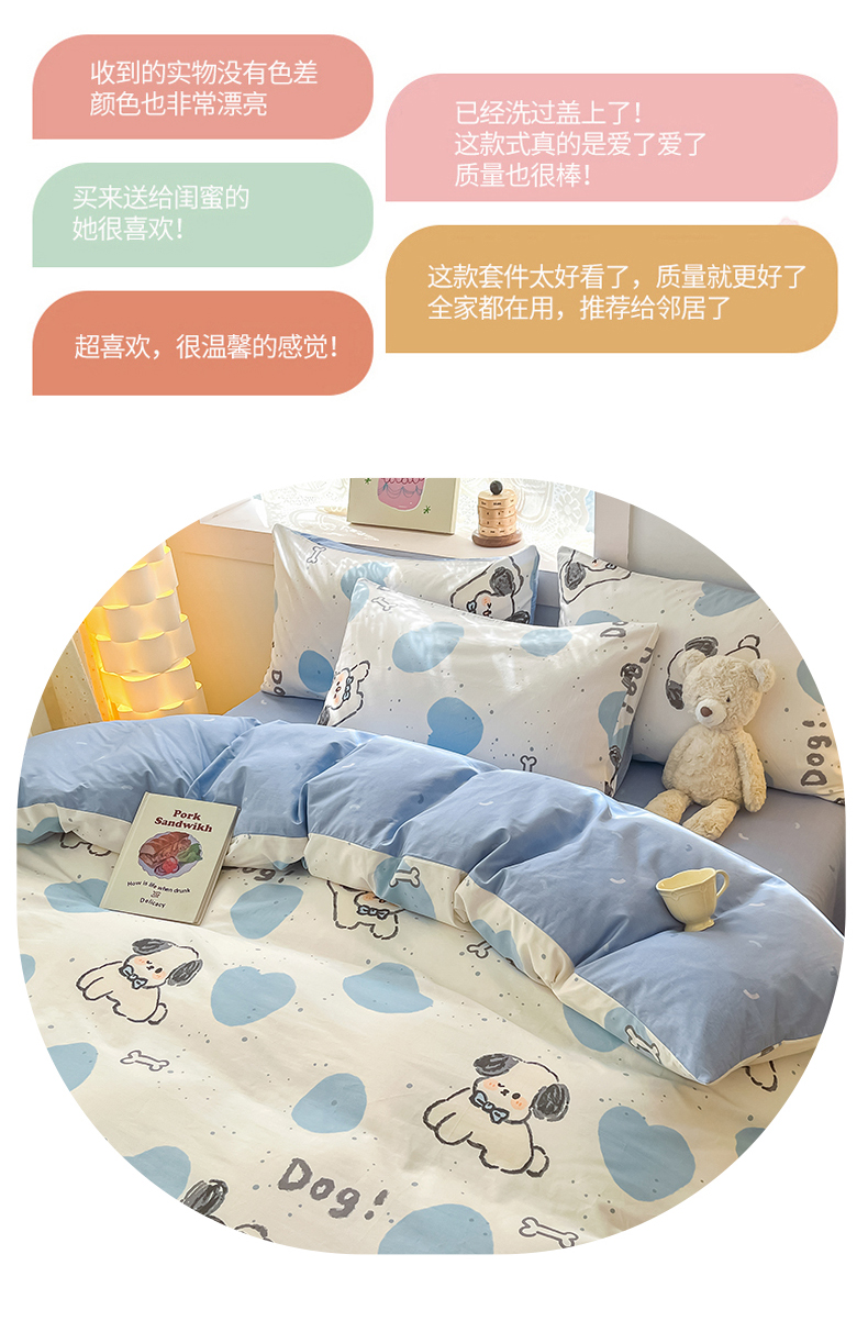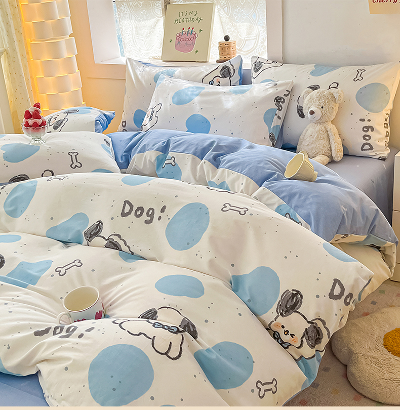 (总)曼之夏 2025新款全棉纯棉40支学生季卡通印花四件套,椰蓝小腊肠,茶茶狗,格子猫,嗨皮狗,开心屋,可爱多,可可汪,玛奇朵,奶昔小熊,泡芙小象,曲奇小狗,趣味熊,甜甜圈,甜心猫咪,童画,小狗日记,樱桃熊仔