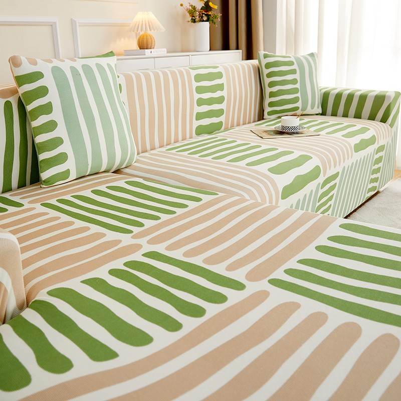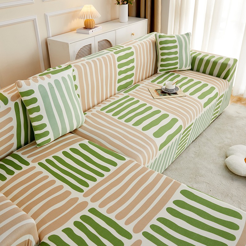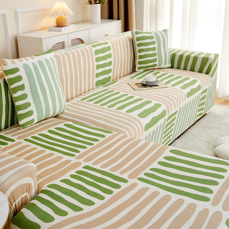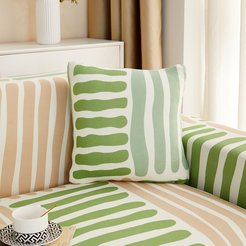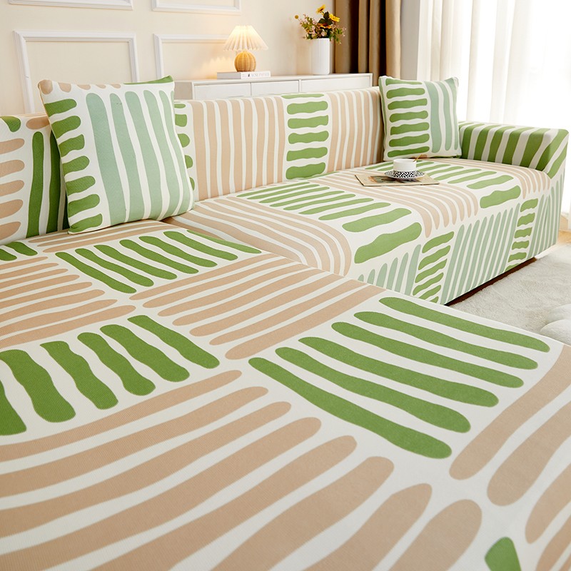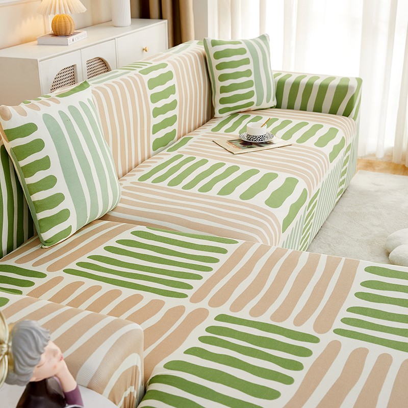 丝绮鹿2023针织柔肤格贵妃沙发套松紧款 买一个沙发套默认送一个抱枕套 米绿条纹