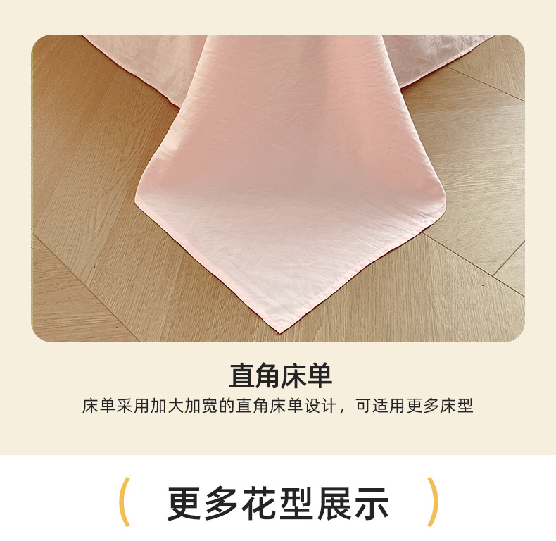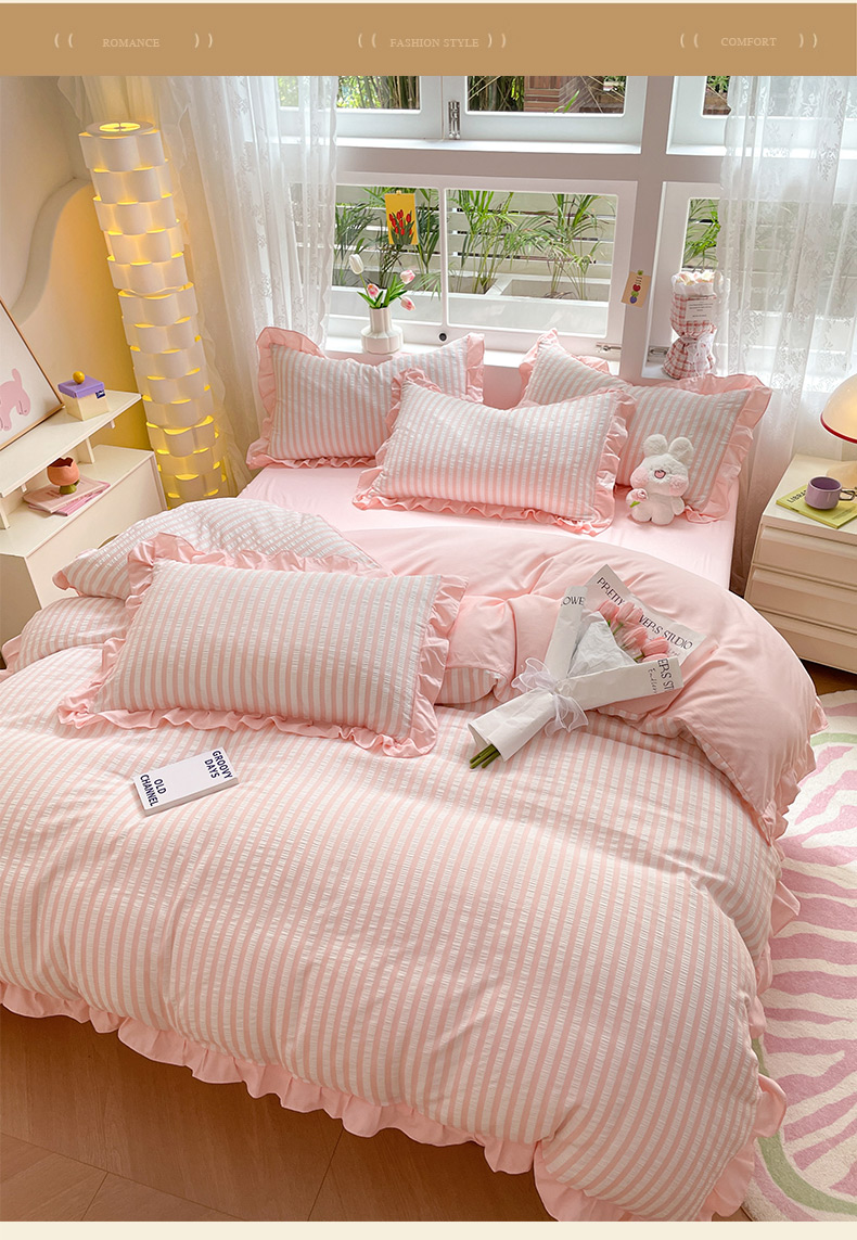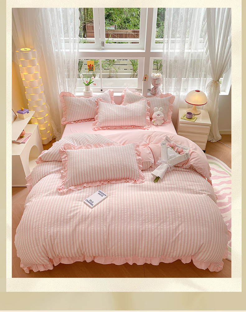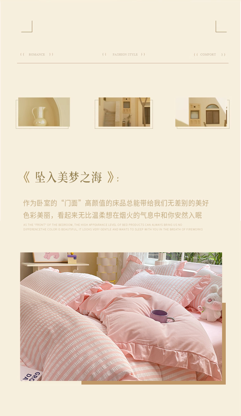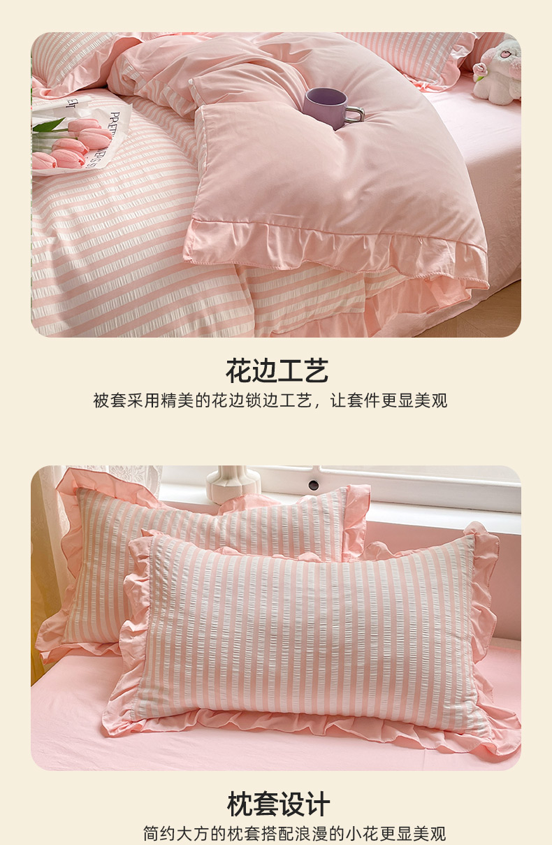 商品名称:苏木年华 2024新款水洗棉竖条纹泡泡纱小清新花边四件套 泡泡纱- 初恋粉